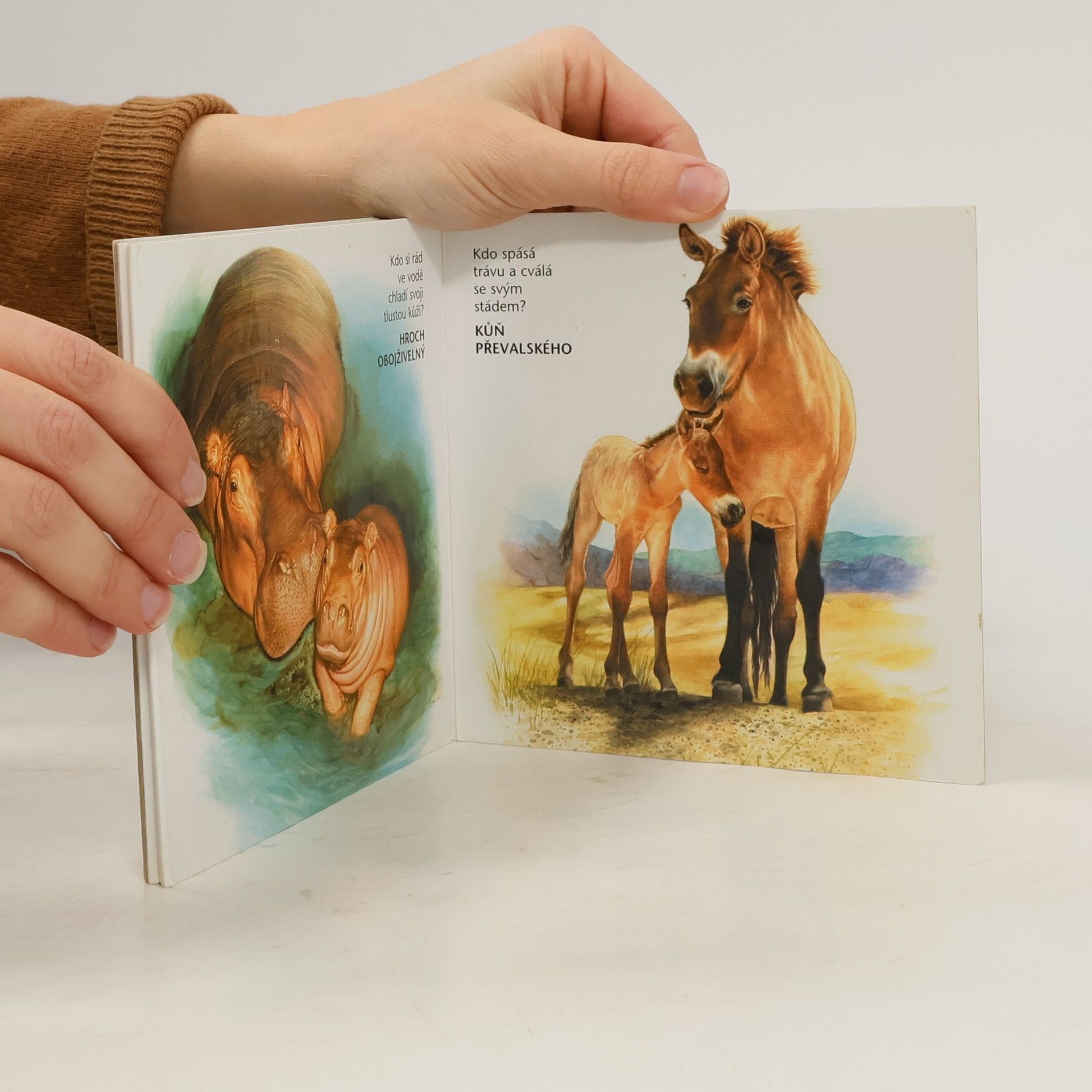 Nové leporelo s realistickými obrázky zvířat od našich předních autorů vědeckých ilustrací. Na 12 stranách najdeme vždy dospělé zvíře s mládětem a krátkým popisem jejich typické vlastnosti. Setkáme se zde například s nejrychlejším gepardem, s koalou, který prospí spoustu času, s hrochem, chladícím si svou tlustou kůži ve vodě nebo s pandou mlsající bambusové výhonky.