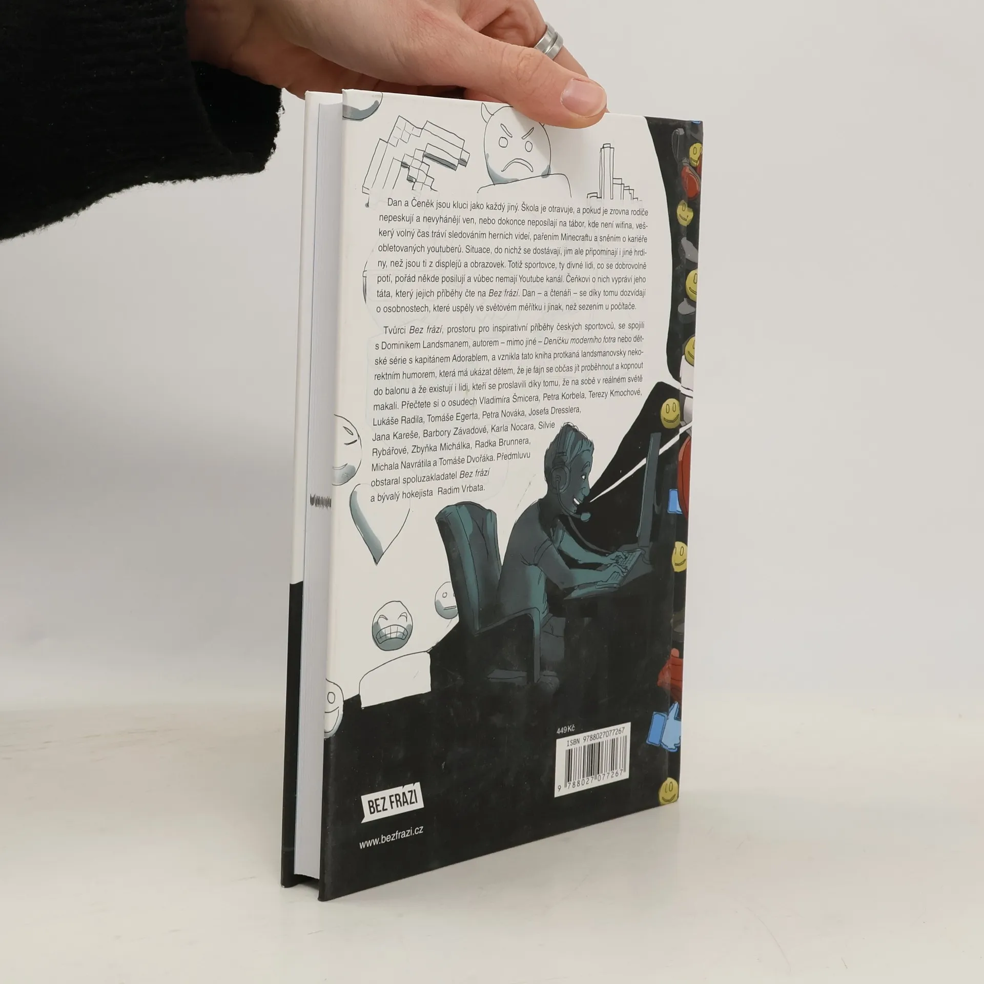Příběhy Bez frází pro děti přinášejí osudy výjimečných českých sportovců, které vypráví oblíbený spisovatel Dominik Landsman tak, aby jim rozuměli i školáci. Hlavní postavy, Dan a Čeněk, jsou kluci, kteří se potýkají s nudou ve škole, a když je rodiče nevyhánějí ven, tráví čas sledováním herních videí a sněním o kariéře youtuberů. Čeněk se ale dozvídá o sportovcích, kteří se snaží uspět v reálném světě, a to mu pomáhá pochopit, že existují i jiní hrdinové než ti z obrazovek. Kniha, plná Landsmanova nekorektního humoru, ukazuje dětem, že je důležité občas se hýbat a usilovat o své sny. Bez frází spojilo síly s Dominikem Landsmanem a výsledkem je dílo, které motivuje k aktivnímu životnímu stylu. Formát „klasických“ Bez frází zahrnuje 210 stran, na kterých Dan a Čeněk řeší příběhy sportovců jako Vladimír Šmicera, Petr Korbel, Tereza Kmochová a další. Předmluvu napsal spoluzakladatel Bez frází Radim Vrbata. Kniha je určena pro děti, které se chtějí inspirovat úspěchy sportovců a naučit se, že tvrdá práce a odhodlání mohou vést k úspěchu.