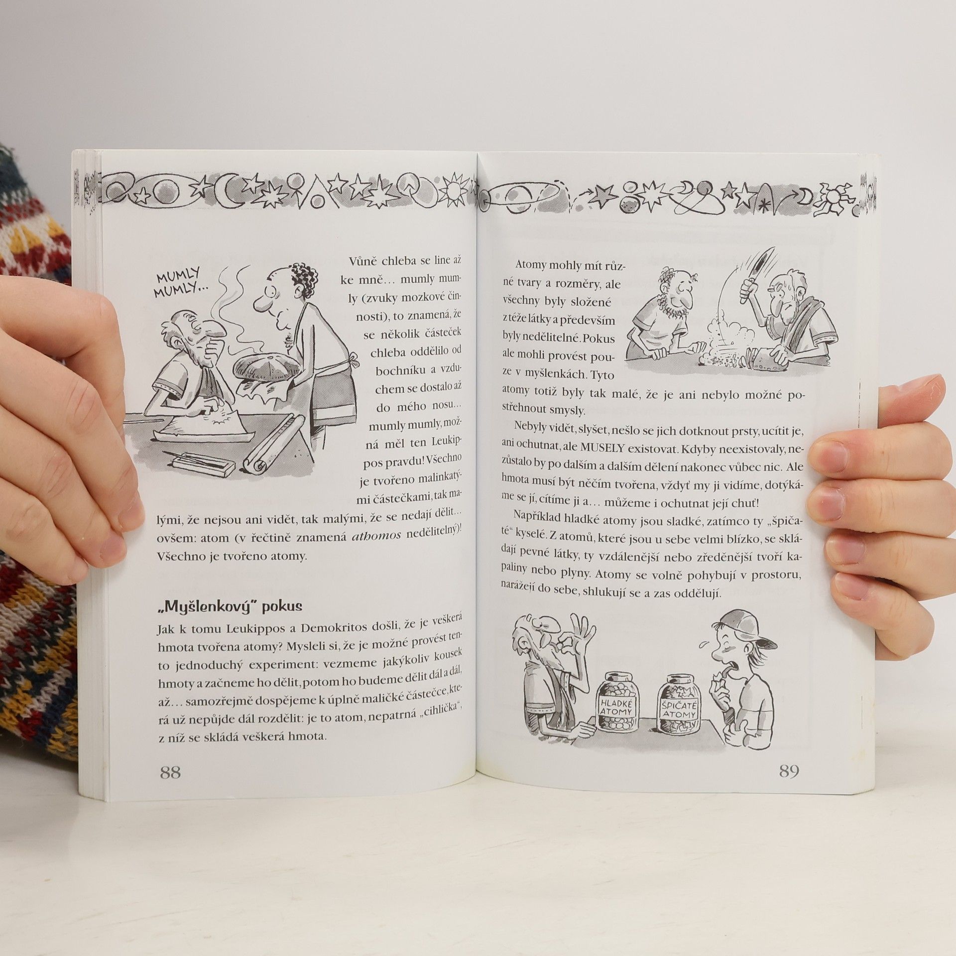 Knížka mapující první nesmělé pokroky vědy v Egyptě a Mezopotámii, důležité objevy slavných řeckých učenců a příspěvky Římanů je psána v podobě fiktivních rozhovorů dítěte s učencem či filozofem, který se mu snaží co nejsrozumitelnějším způsobem vysvětlit svouteorii a vyvrátit případné námitky. Některé problémy jsou doplněny jednoduchým praktickým cvičením, které si čtenář může provést i doma, a přiblížit si tak zajímavým způsobem základní otázky matematiky a fyziky.