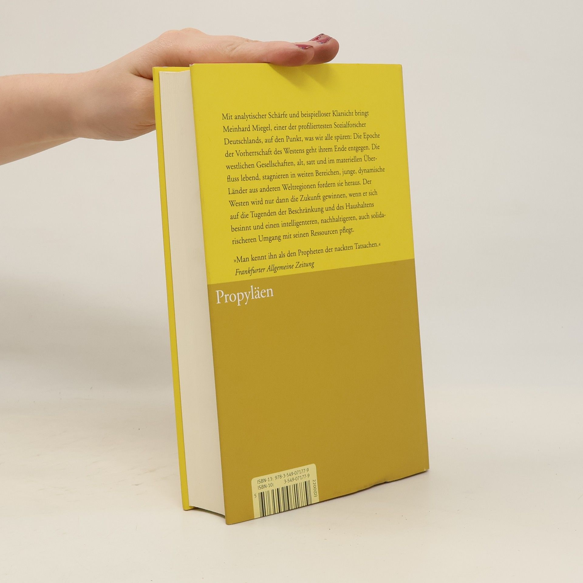 Mit analytischer Schärfe und beispielloser Klarheit bringt Meinhard Miegel auf den Punkt, was alle spüren: Die Epoche der Vorherrschaft des Westens geht zu Ende. Die westlichen Gesellschaften, alt, satt und im Überfluß lebend, stagnieren in weiten Bereichen - junge, dynamische Länder aus anderen Weltregionen fordern sie heraus. Der Westen wird nur dann die Zukunft gewinnen, wenn er sich auf die Tugenden der Beschränkung und des Haushaltens besinnt und einen intelligenteren, nachhaltigeren und solidarischeren Umgang mit seinen Ressourcen pflegt. Wenn Sie Herrn Prof. Miegel als Redner buchen möchten, klicken Sie bitte hier.