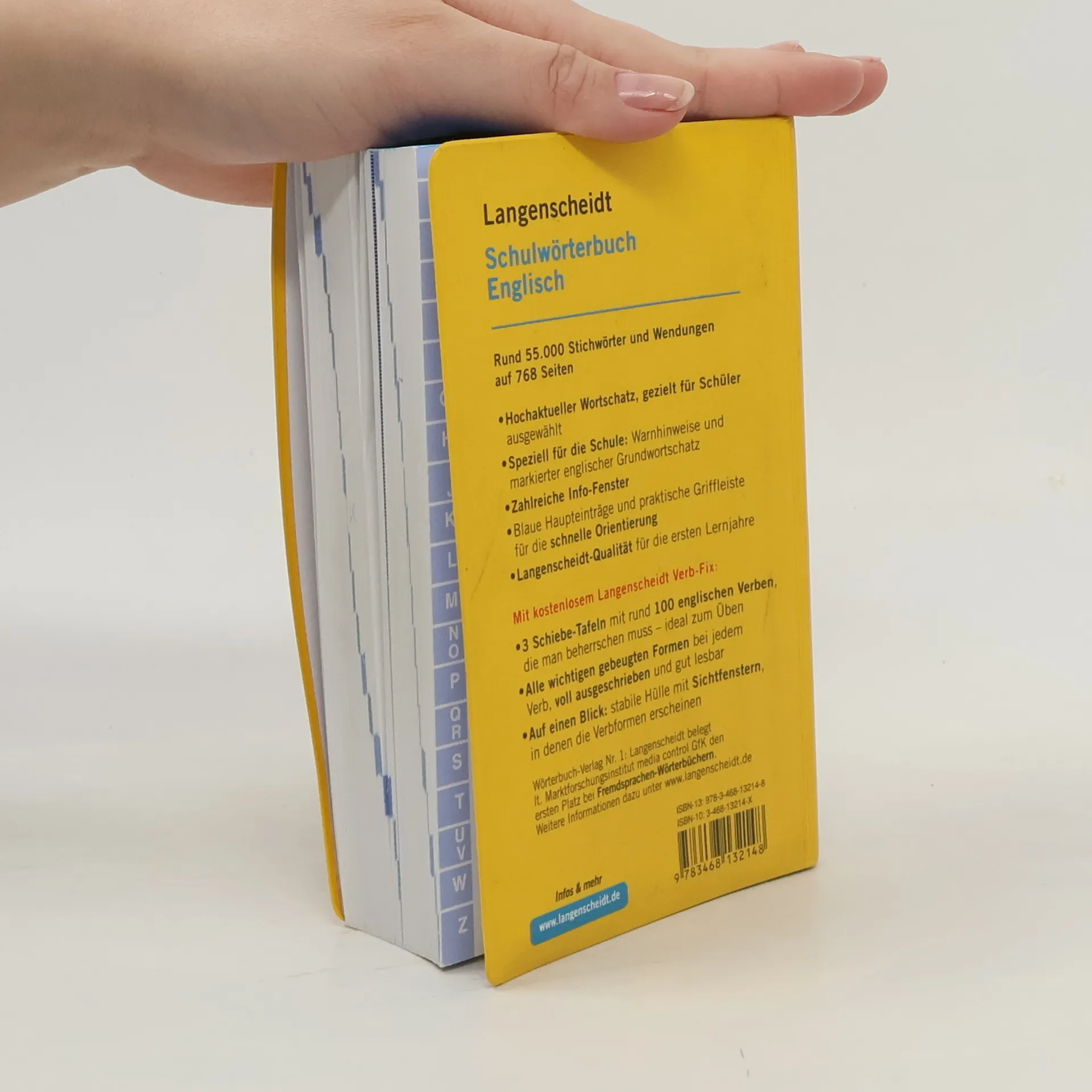 Hochaktueller Wortschatz, innovative POWER-Merkmale, für Schüler an allen Schulen, v. a. in den ersten Lernjahren: das beliebte Schulwörterbuch. Rund 55.000 Stichwörter und Wendungen, gezielt für Schüler ausgewählter Inhalt alle Stichwörter in Blau zahlreiche blaue Info-Fenster zu Wortschatz, Fehlervermeidung und Landeskunde Kennzeichnung des englischen Grundwortschatzes mit den bewährten didaktischen Hilfen: Warndreiecke bei Fehlerquellen, viele grammatische Angaben etc. Inklusive kostenlosem Verb-Fix: Die fremdsprachigen Verben, die man beherrschen muss. 3 praktische vierseitige Schiebe-Tafeln in einer stabilen Hülle mit mehreren Sichtfenstern, in denen die Verbformen erscheinen. Für Englisch je 100 Verben. Alle wichtigen gebeugten Formen bei jedem Verb. Alle Verbformen voll ausgeschrieben und gut lesbar. Ideal zum Üben.