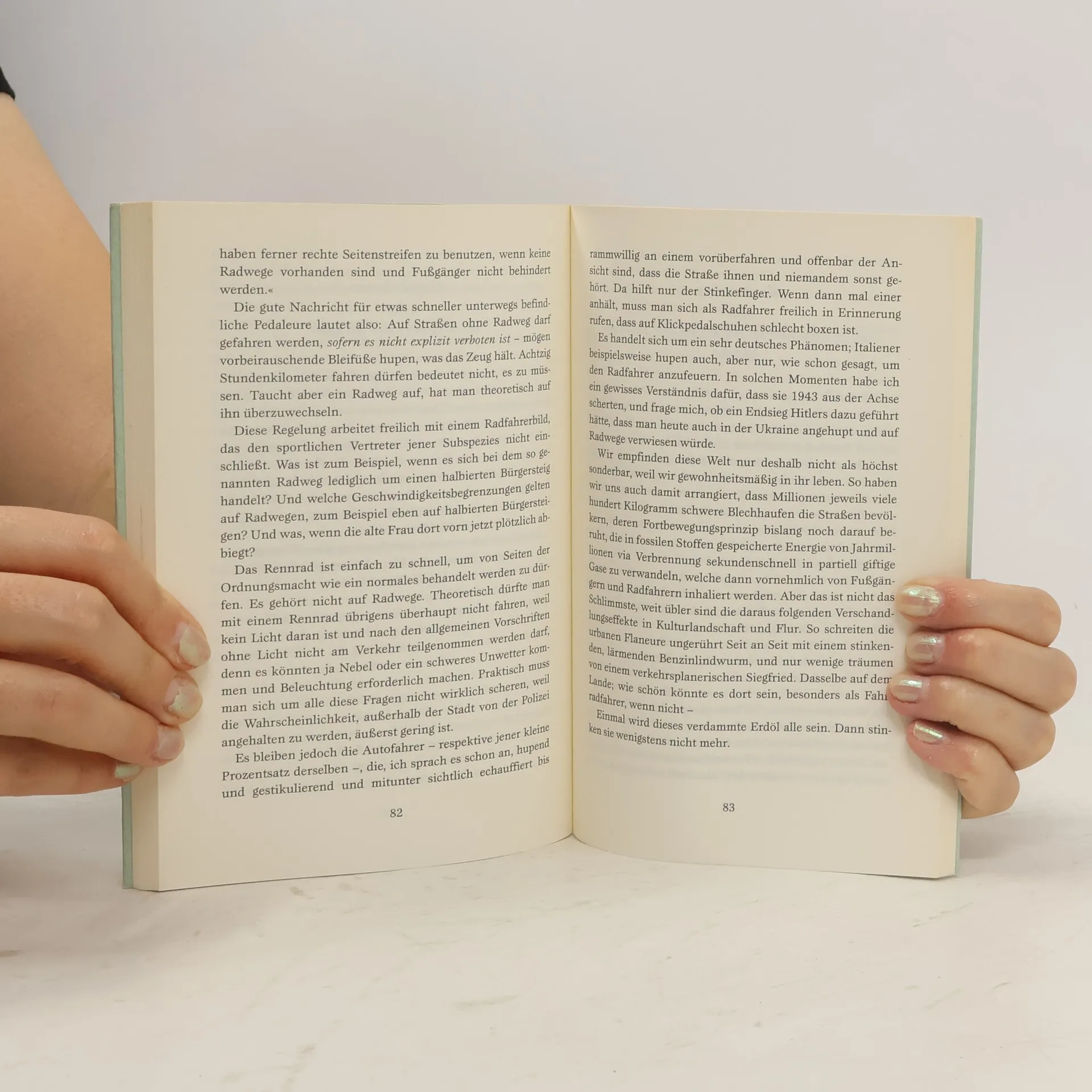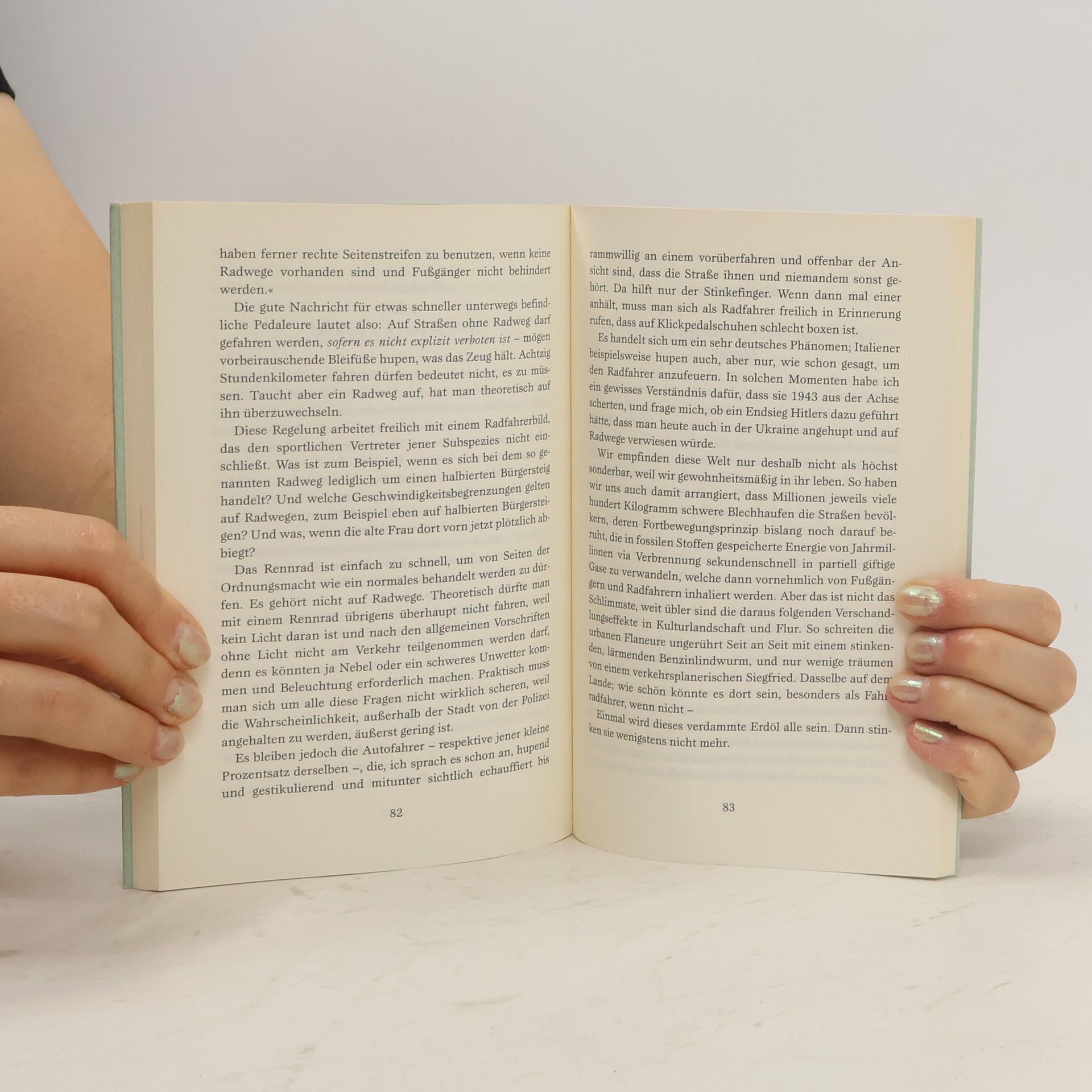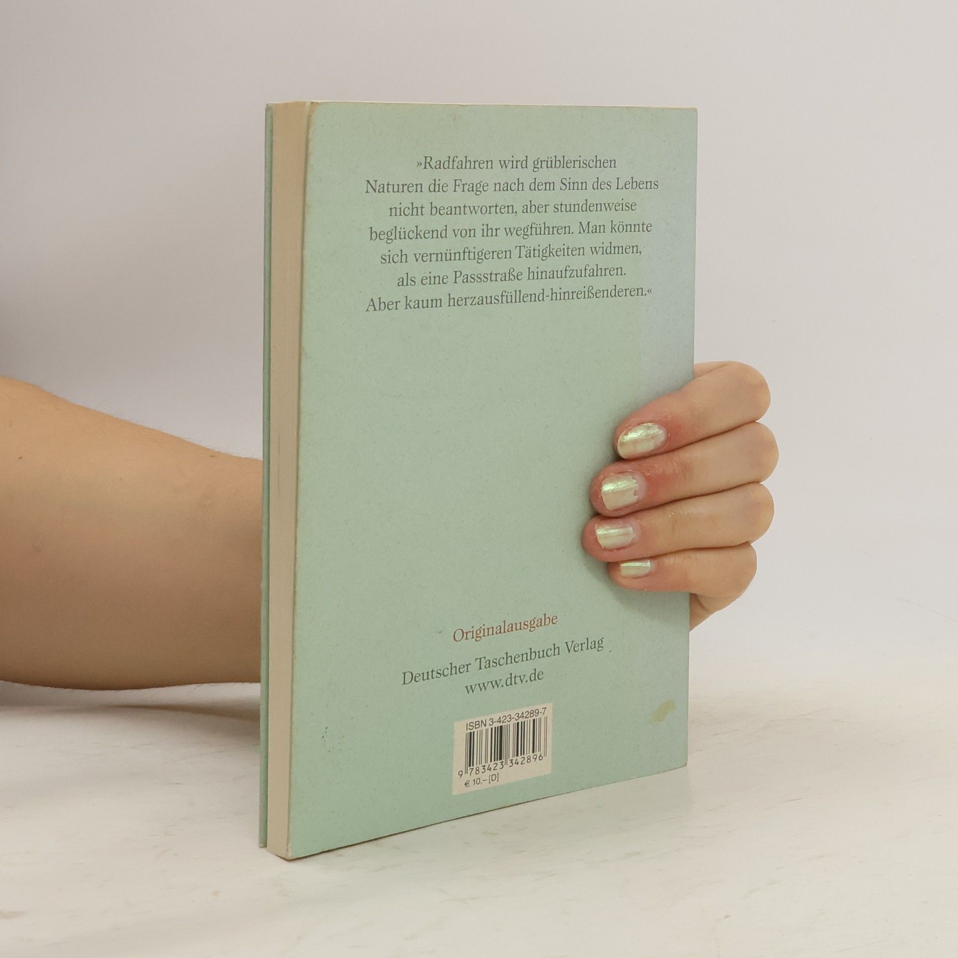 Radfahren ist mehr als stumpfsinnige Pedaltreterei, meint der Autor, nämlich – u. a. – Schmerzgenuss, Tanz, geistig-seelische Entschlackung, Präludium (und Freibrief) für jede Art Bacchanal, mitunter auch erotisches Vorspiel, jedenfalls nicht nur eine Tätigkeit der Muskeln, sondern nicht minder des Kopfes. Seine Analyse des durchaus suchtrelevanten Phänomens beruht auf jahrelangem Selbstversuch und erstreckt sich thematisch von Aristoteles bis Armstrong (Lance), von Bergauffahren bis Beinrasur, von Wiegetritt bis Wagner (Richard). Der Verfasser unterlässt es keineswegs, darauf hinzuweisen, dass wie allen Passionen auch dieser neben ihrer emi- und permanenten Glücksversprechenseinlösung ein gewisses Maß an Bescheuertheit eignet. Am ehesten verdichtet sich seine Passionsspiel-Philosophie in dem Merksatz: »Wer sich nach einer ausgiebigen Trainingstour den lukullischen Wonnen verschließt, ist – sofern er nicht mit Radfahren sein Geld verdienen muss – ein Idiot.«