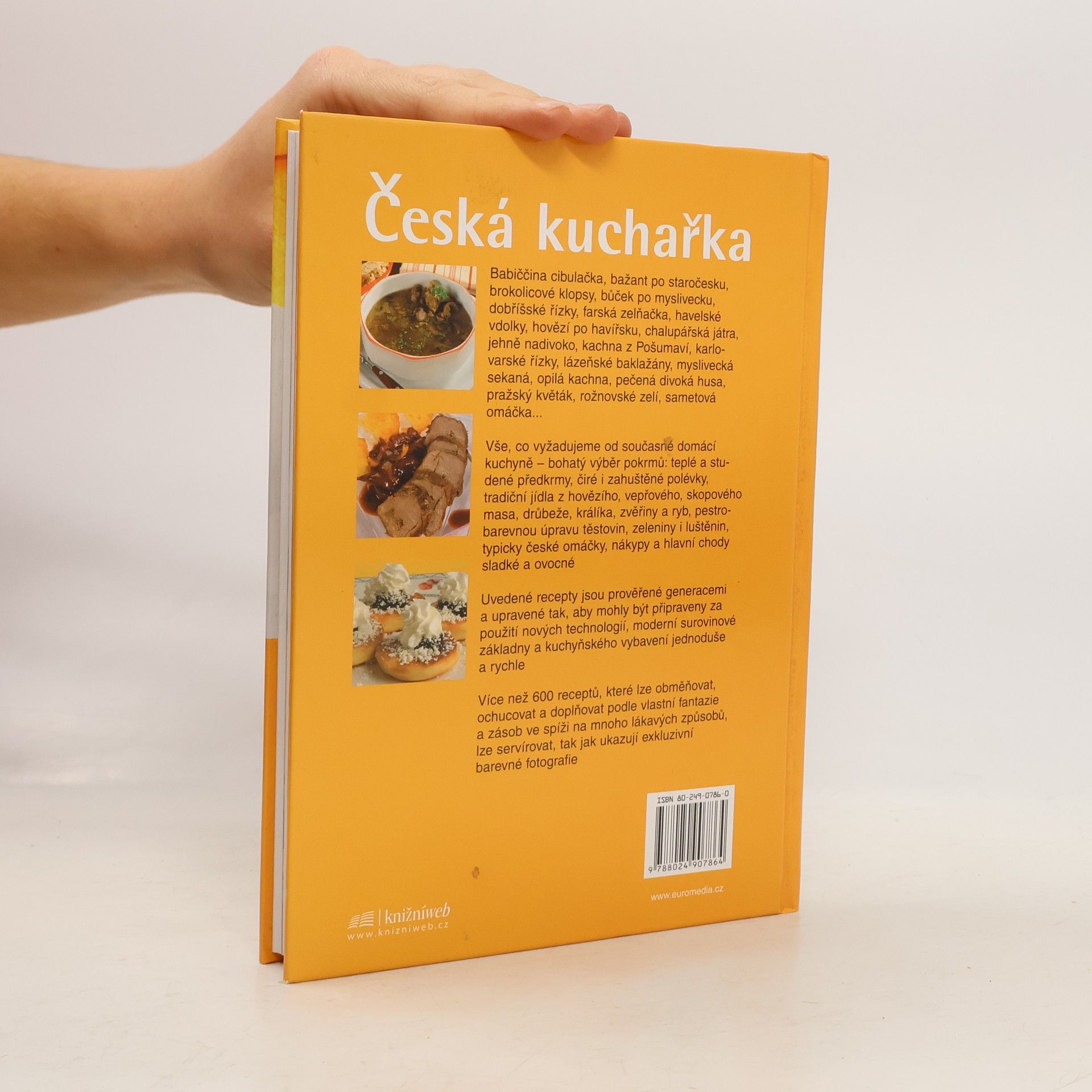 Česká kuchařka Babiččina cibulačka, bažant po staročesku, brokolicové klopsy, bůček po myslivecku, dobříšské řízky, farská zelňačka, havelské vdolky, hovězí po havířsku, chalupářská játra, jehně nadivoko, kachna z Pošumaví, karlovarské řízky, lázeňské baklažány, myslivecká sekaná, opilá kachna, pečená divoká husa, pražský květák, rožnovské zelí, sametová omáčka... Vše, co vyžadujeme od současné domácí kuchyně - bohatý výběr pokrmů: teplé a studené předkrmy, čiré i zahuštěné polévky, tradiční jídla z hovězího, vepřového, skopového masa, drůbeže, králíka, zvěřiny a ryb, pestrobarevnou úpravu těstovin, zeleniny i luštěnin, typicky české omáčky, nákypy a hlavní chody sladké a ovocné Uvedené recepty jsou prověřené generacemi a upravené tak, aby mohly být připraveny za použití nových technologií, moderní surovinové základny a kuchyňského vybavení jednoduše a rychle Více než 600 receptů, které lze obměňovat, ochucovat a doplňovat podle vlastní fantazie a zásob ve spíži na mnoho lákavých způsobů, lze servírovat, tak jak ukazují exkluzivní barevné fotografie