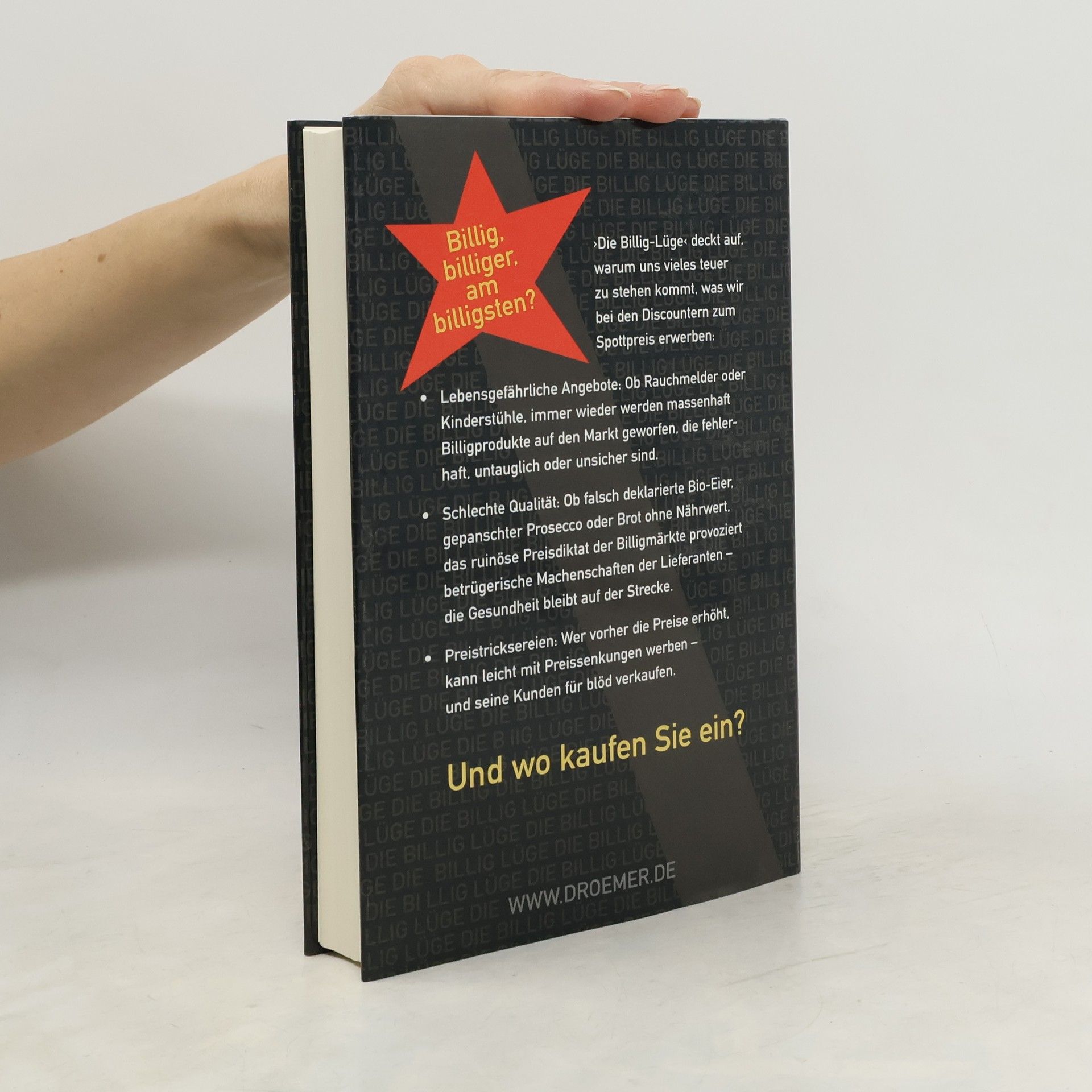 Billig, billiger, am billigsten? Die Billig-Lüge deckt auf, warum uns vieles teuer zu stehen kommt, was wir bei den Discountern zum Spottpreis erwerben: Lebensgefährliche Angebote: Ob Rauchmelder oder Kinderstühle, immer wieder werden massenhaft Billigprodukte auf den Markt geworfen, die fehlerhaft, untauglich oder unsicher sind. Schlechte Qualität: Ob falsch deklarierte Bio-Eier, gepanschter Prosecco oder Brot ohne Nährwert, das ruinöse Preisdiktat der Billigmärkte provoziert betrügerische Machenschaften der Lieferanten – die Gesundheit bleibt auf der Strecke. Preistricksereien: Wer vorher die Preise erhöht, kann leicht mit Preissenkungen werben – und seine Kunden für blöd verkaufen. Und wo kaufen Sie ein?