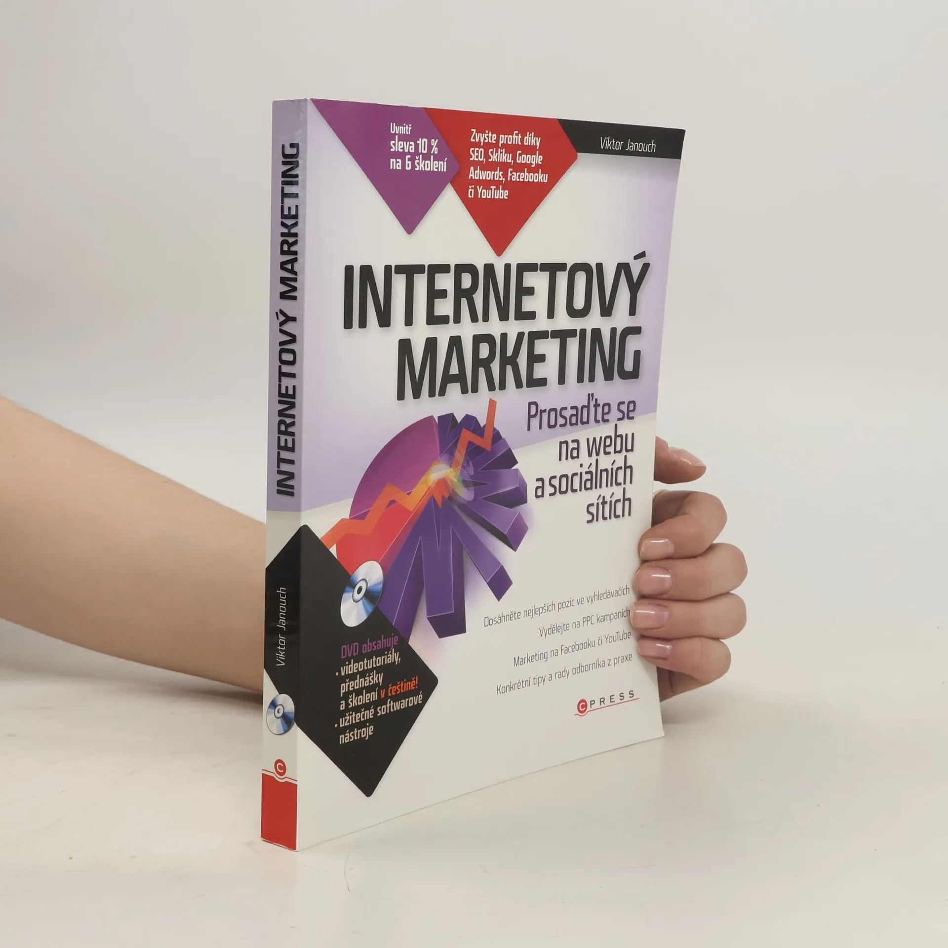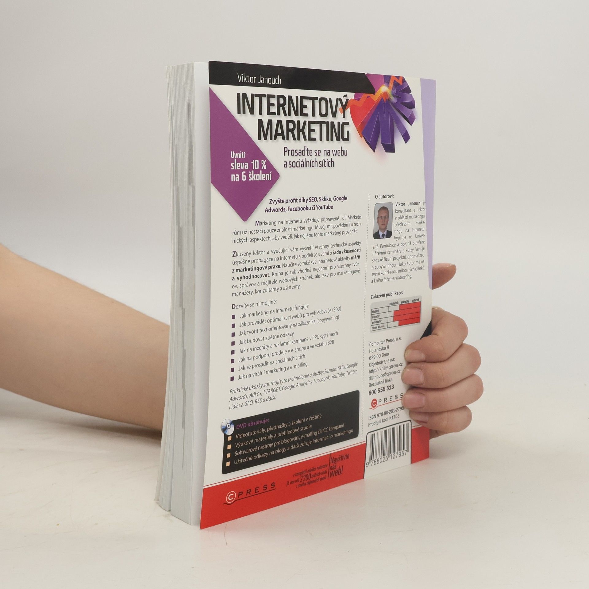 Zvyšte svůj profit díky SEO, Skliku, Google Adwords, Facebooku či YouTube! Marketing na Internetu vyžaduje připravené lidi, kteří mají nejen znalosti marketingu, ale také povědomí o technických aspektech. Zkušený lektor vám vysvětlí všechny technické aspekty úspěšné propagace a podělí se o cenné zkušenosti z praxe. Naučíte se měřit a vyhodnocovat své internetové aktivity. Kniha je určena tvůrcům, správcům a majitelům webových stránek, marketingovým manažerům, konzultantům a asistentům. Dozvíte se, jak marketing na Internetu funguje, jak provádět optimalizaci webů pro vyhledávače (SEO), jak tvořit texty orientované na zákazníka (copywriting), budovat zpětné odkazy, spravovat inzeráty a reklamní kampaně v PPC systémech, podporovat prodej v e-shopu a ve vztahu B2B, prosadit se na sociálních sítích, a jak na virální marketing a e-mailing. Praktické ukázky zahrnují technologie a služby jako Seznam Sklik, Google Adwords, Google Analytics, Facebook a další. DVD obsahuje videotutoriály, školení, výukové materiály a užitečné odkazy na blogy a další zdroje informací o marketingu. Autor, Viktor Janouch, je konzultant a lektor v oblasti marketingu, vyučuje na Univerzitě Pardubice a má na svém kontě řadu odborných článků.