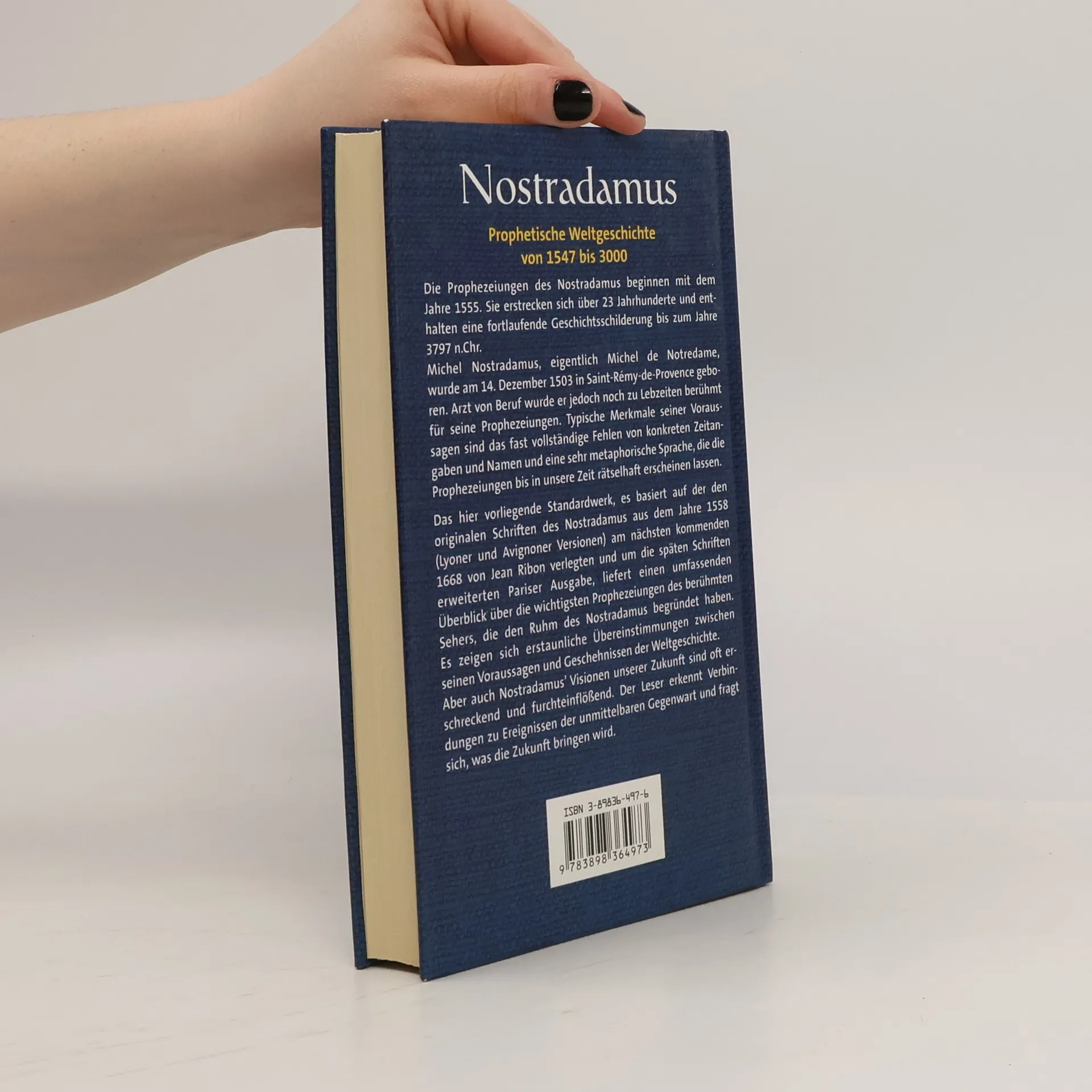 Die Prophezeiungen des Nostradamus beginnen mit dem Jahre 1555. Sie erstrecken sich über 23 Jahrhunderte und enthalten eine fortlaufende Geschichtsschreibung bis zum Jahre 3797 n. Chr. Michel Nostradamus, eigentlich Michel de Notredame, wurde am 14. Dezember 1503 in Saint-Rémy-de-Provence geboren. Arzt von Beruf wurde er jedoch noch zu Lebzeiten berühmt für seine Prophezeiungen. Typische Merkmale seiner Voraussagen sind das fast vollständige Fehlen von konkreten Zeitangaben und Namen und eine sehr metaphorische Sprache, die die Prophezeiungen bis in unsere Zeit rätselhaft erscheinen lassen. Das hier vorliegende Werk, es basiert auf der den Originalschriften des Nostradamus aus dem Jahre 1558 am nächsten kommenden 1668 von Jean Ribon verlegten und um die späten Schriften erweiterten Pariser Ausgabe, liefert einen umfassenden Überblick über die wichtigsten Prophezeiungen des berühmten Sehers, die den Ruhm des Nostradamus begründet haben.
