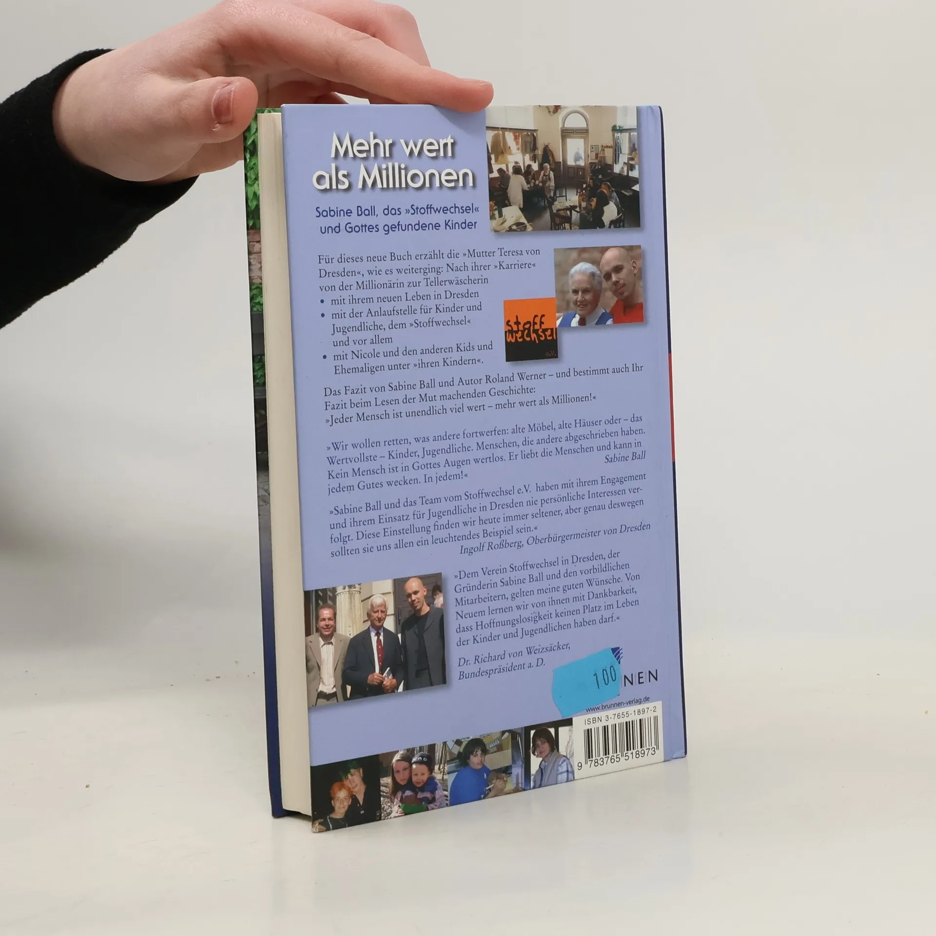 Sabine Ball erzählt in „Mehr wert als Millionen“, wie es weiterging: Nach ihrer „Karriere“ von der Millionärin zur Tellerwäscherin … mit ihrem neuen Leben in Dresden, … mit der Anlaufstelle für Kinder und Jugendliche „café stoffwechsel“, … und vor allem mit Mo, NN und all den anderen „Kindern der Mutter Teresa von Dresden“. Aufgezeichnet ist ihr Bericht von Roland Werner – der wie Sabine Ball einen Blick und ein Herz für die junge Generation hat. Und für Gott, der im Leben von jungen und alten Menschen ganz überraschend Geschichte schreiben kann!