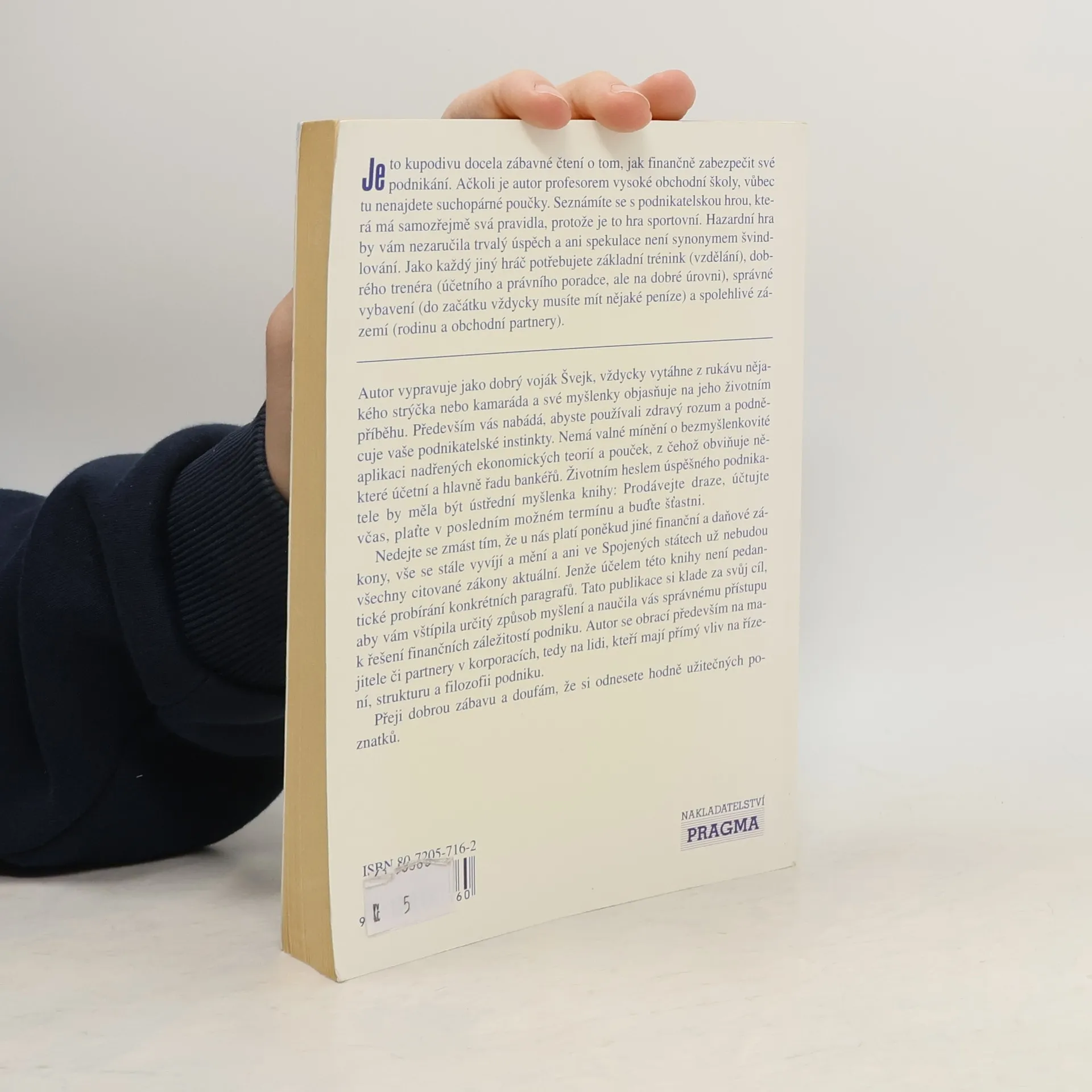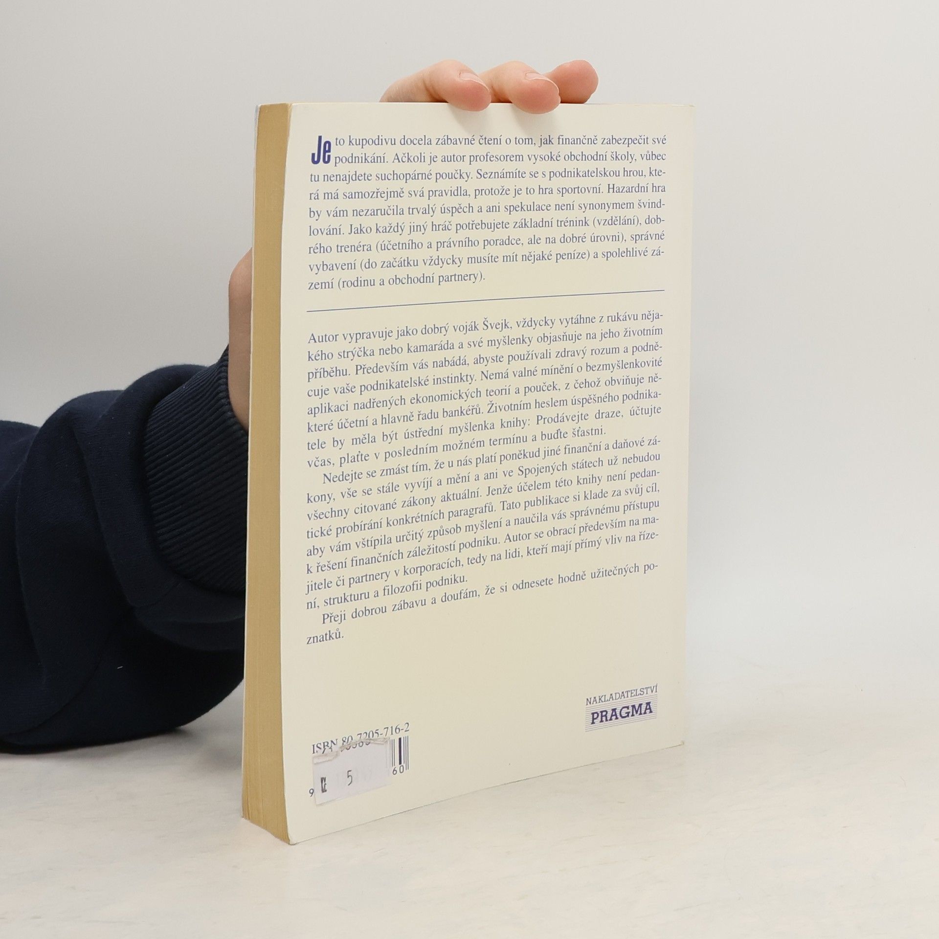 Je to kupodivu docela zábavné čtení o tom, jak finančně zabezpečit své podnikání. Ačkoli je autor profesorem vysoké obchodní školy, vůbec tu nenajdete suchopárné poučky. Seznámíte se s podnikatelskou hrou, která má samozřejmě svá pravidla, protože je to hra sportovní. Hazardní hra by vám nezaručila trvalý úspěch a ani spekulace není synonymem švindlování. Jako každý jiný hráč potřebujete základní trénink (vzdělání), dobrého trenéra (účetního a právního poradce, ale na dobré úrovni), správné vybavení (do začátku vždy musíte mít nějaké peníze) a spolehlivé zázemí (rodinu a obchodní partnery). ... Účelem knihy není pedantské probírání určitých paragrafů. Tato publikace si klade za svůj cíl vštipit vám určitý způsob myšlení a naučit vás správnému přístupu k řešení finančních záležitostí podniku.