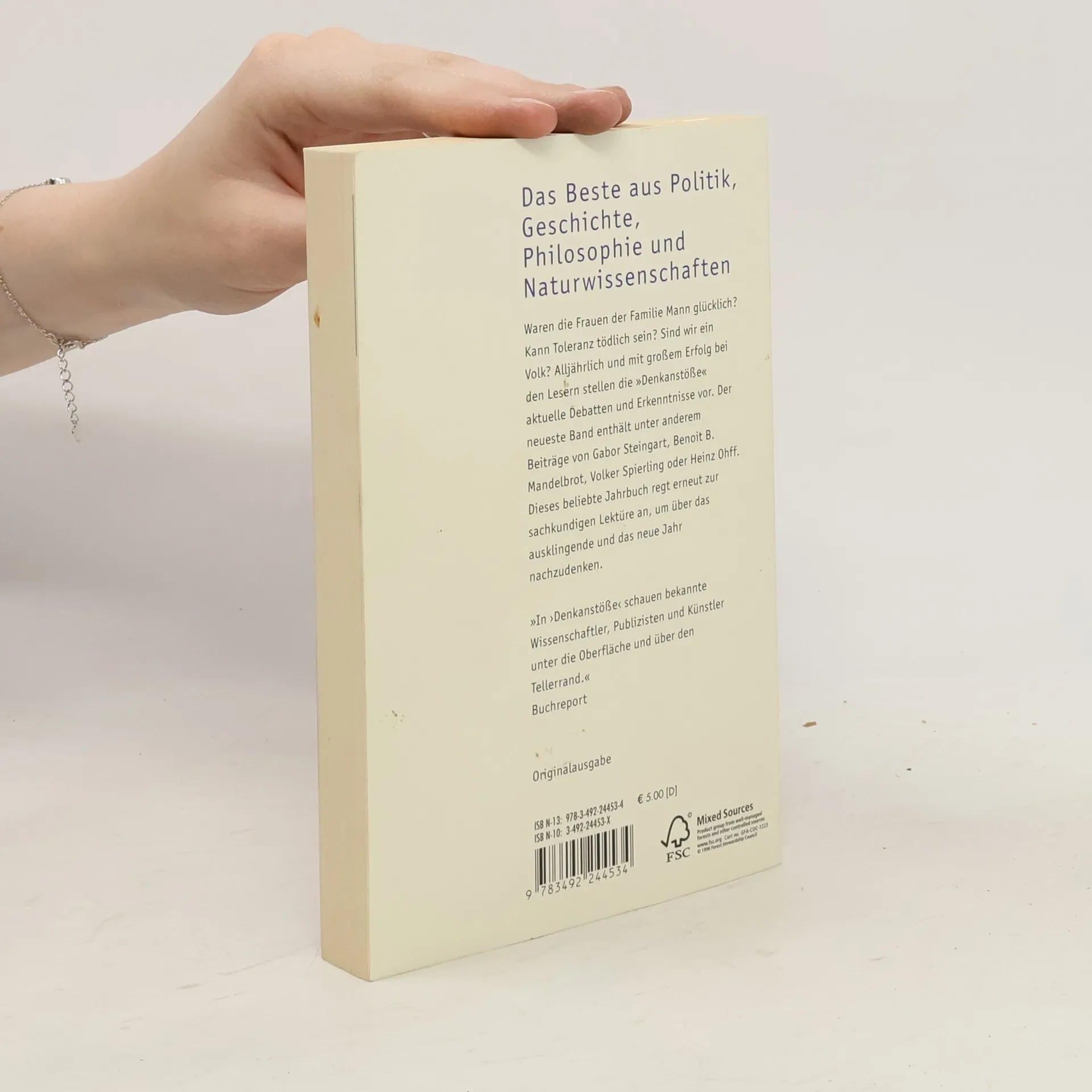 Waren die Frauen der Familie Mann glücklich? Kann Toleranz tödlich sein? Sind wir ein Volk? Alljährlich und mit großem Erfolg bei den lesern stellen die "Denkanstöße" aktuelle Debatten und Erkenntnisse vor. Der neueste Band enthält unter anderem Beiträge von Gabor Steingart, Benoît B. Mandelbrot, Volker Spierling oder Heinz Ohff. Dieses beliebte Jahrbuch regt erneut zur Lektüre an, um über das ausklingende und das neue Jahr nachzudenken.