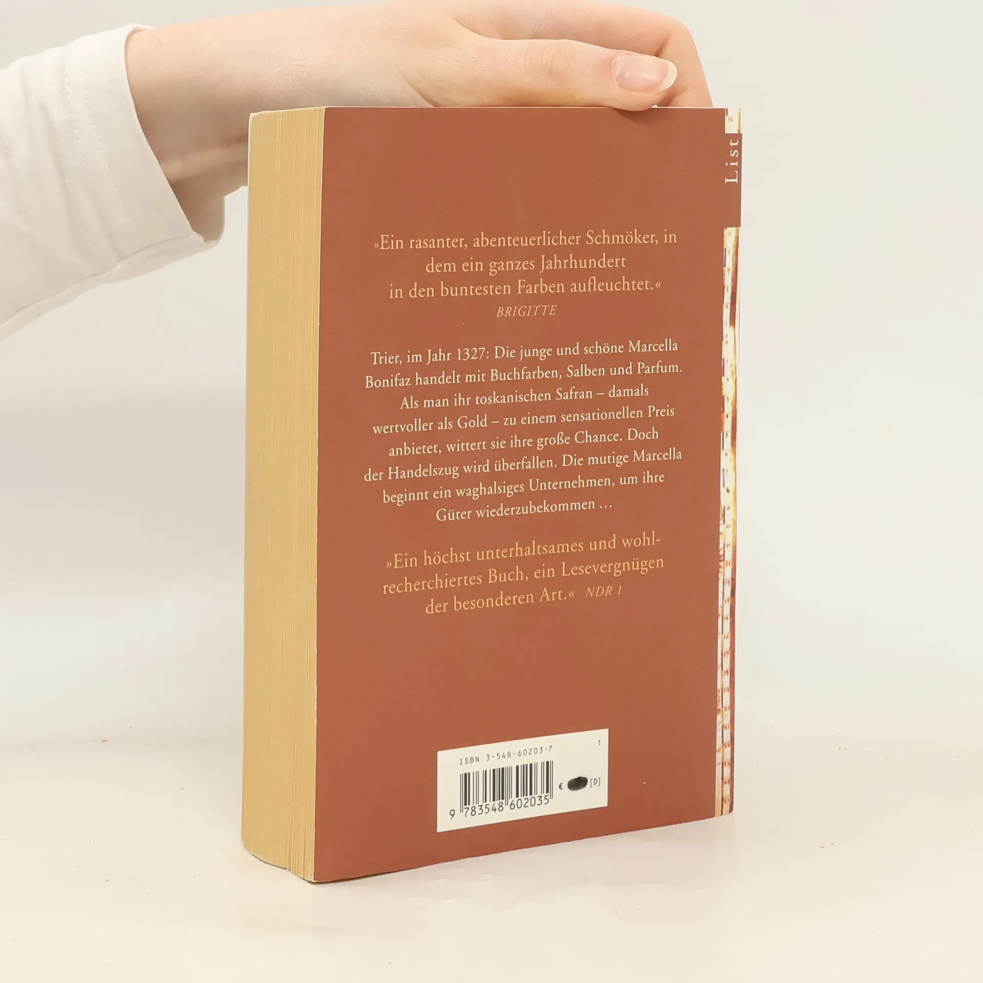 Trier, im Jahr 1327: Die junge und schöne Marcella Bonifaz handelt mit Buchfarben, Salben und Parfum. Als man ihr toskanischen Safran - damals wertvoller als Gold - zu einem sensationellen Preis anbietet, wittert sie ihre große Chance. Doch der Handelszug wird überfallen. Die mutige Marcella beginnt ein waghalsiges Unternehmen, um ihre Güter wiederzubekommen...