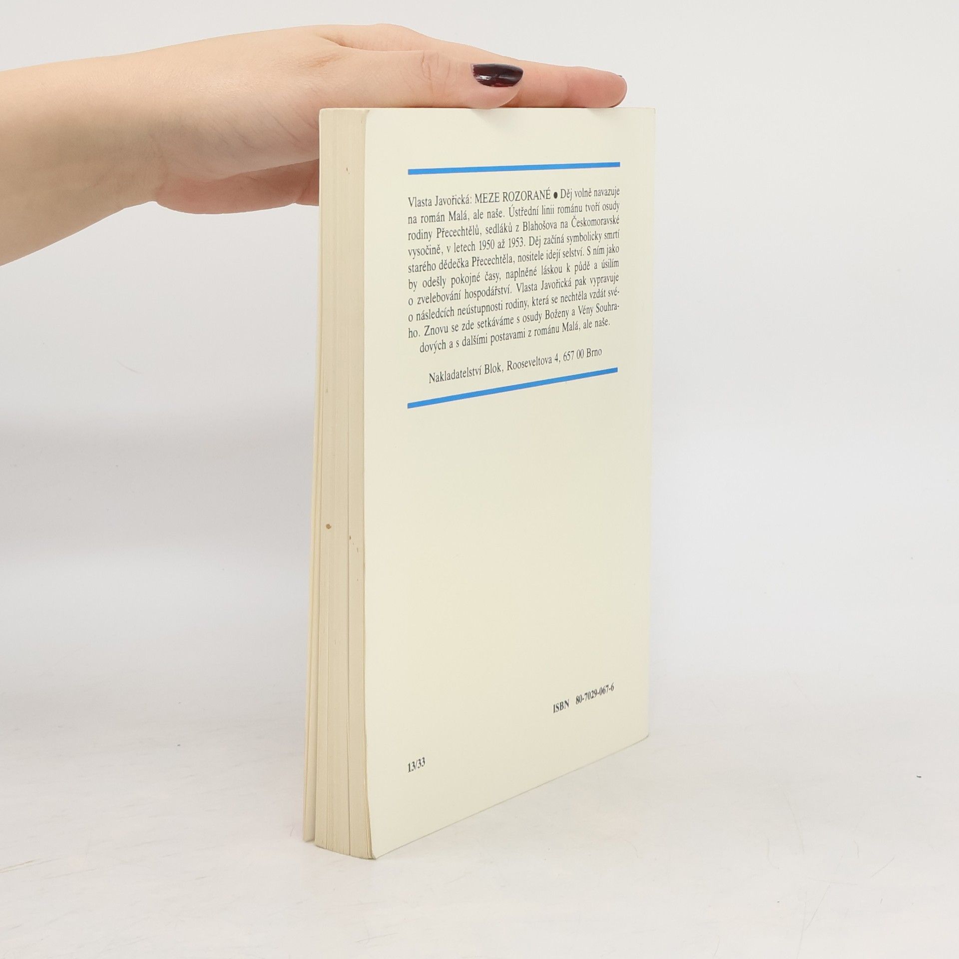 Dramata mladých lidí s rodinnými a milostnými konflikty, na pozadí dodnes citlivých otázek česko-německých vztahů, tvoří osu napínavého vyprávění z konce třicátých let minulého století. Rozsáhlému obrazu lásky, vlastenectví i zrady nechybí lyrický náboj. Na tento román volně navazuje kniha "Meze rozorané" od stejné autorky.