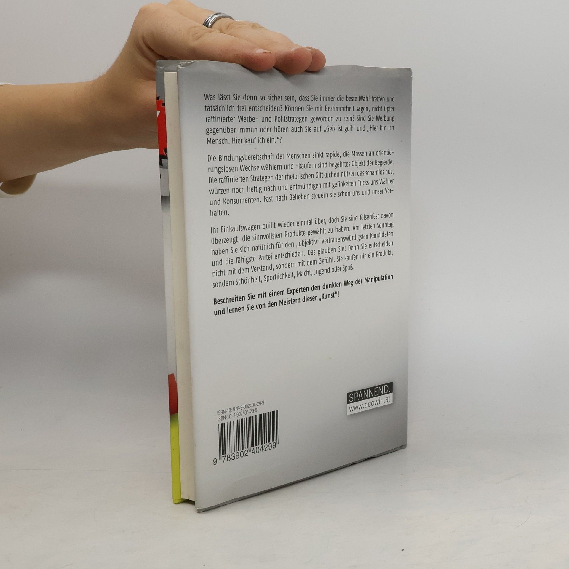 Was lässt Sie denn so sicher sein, dass Sie immer die beste Wahl treffen und tatsächlich frei entscheiden? Können Sie mit Bestimmtheit sagen, nicht Opfer raffinierter Werbe- und Politstrategen geworden zu sein? Sind Sie Werbung gegenüber immun oder hören auch Sie auf „Geiz ist geil“ und „Hier bin ich Mensch. Hier kauf ich ein.“? Die Bindungsbereitschaft der Menschen sinkt rapide, die Massen an orientierungslosen Wechselwählern und -käufern sind begehrtes Objekt der Begierde. Die raffinierten Strategen der rhetorischen Giftküchen nützen das schamlos aus, würzen noch heftig nach und entmündigen mit gefinkelten Tricks uns Wähler und Konsumenten. Fast nach Belieben steuern sie schon uns und unser Verhalten. Ihr Einkaufswagen quillt wieder einmal über, doch Sie sind felsenfest davon überzeugt, die sinnvollsten Produkte gewählt zu haben. Am letzten Sonntag haben Sie sich natürlich für den „objektiv“ vertrauenswürdigsten Kandidaten und die fähigste Partei entschieden. Das glauben Sie! Denn Sie entscheiden nicht mit dem Verstand, sondern mit dem Gefühl. Sie kaufen nie ein Produkt, sondern Schönheit, Sportlichkeit, Macht, Jugend oder Spaß. Beschreiten Sie mit einem Experten den dunklen Weg der Manipulation und lernen Sie von den Meistern dieser „Kunst“!