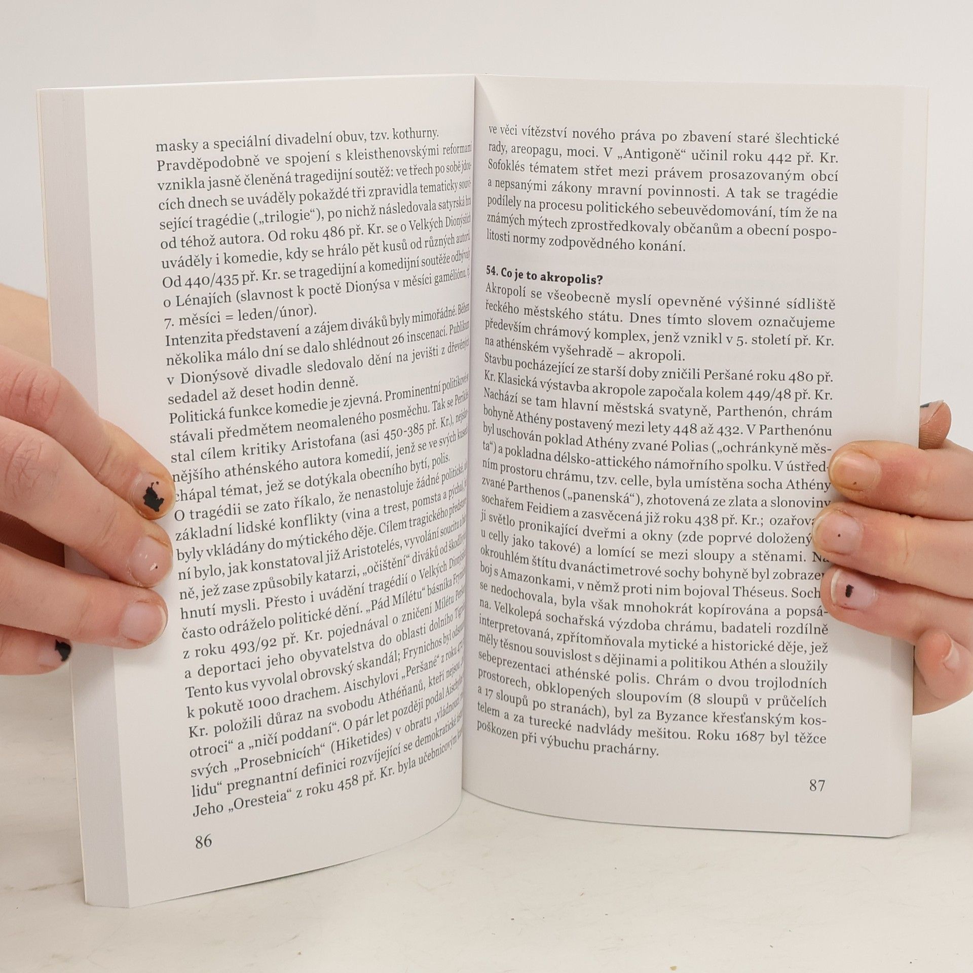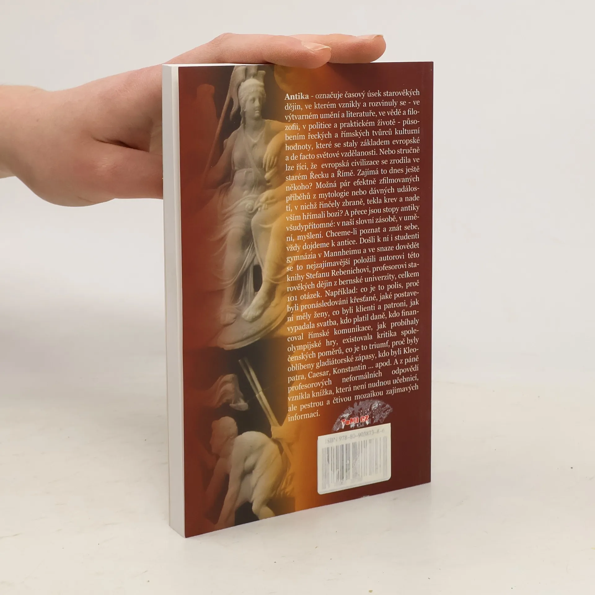 Antika – označuje časový úsek starověkých dějin, ve kterém vznikly a rozvinuly se – ve výtvarném umění a literatuře, ve vědě a filozofii, v politice a praktickém životě – působením řeckých a římských tvůrců kulturní hodnoty, které se staly základem evropské a de facto světové vzdělanosti. Nebo stručně lze říci, že evropská civilizace se zrodila ve starém Řecku a Římě. Zajímá to dnes ještě někoho? Možná pár efektně zfilmovaných příběhů z mytologie nebo dávných událostí, v nichž řinčely zbraně, tekla krev a nade vším hřímali bozi? A přece jsou stopy antiky všudypřítomné: v naší slovní zásobě, v umění, myšlení. Chceme-li poznat a znát sebe, vždy dojdeme k antice. Došli k ní i studenti gymnázia v Mannheimu a ve snaze dovědět se to nejzajímavější položili autorovi této knihy Stefanu Rebenichovi, profesorovi starověkých dějin z bernské univerzity, celkem 101 otázek. Například: co je polis, proč byli pronásledováni křesťané, jaké postavení měly ženy, co byli klienti a patroni, jak vypydala svatba, kdo, platil daně, kdofinancoval římské komunikace, jak probíhaly olympijské hry, existovala kritika společenských poměrů, co je to triumf, proč byly oblíbeny gladiátorské zápasy, kdo byli Kleopatra, Caesar, Konstantin... apod. A z páně profesorových neformálních odpovědí vznikla knížka, která není nudnou učebnicí, ale pestrou a čtivou mozaikou zajímavých informací.