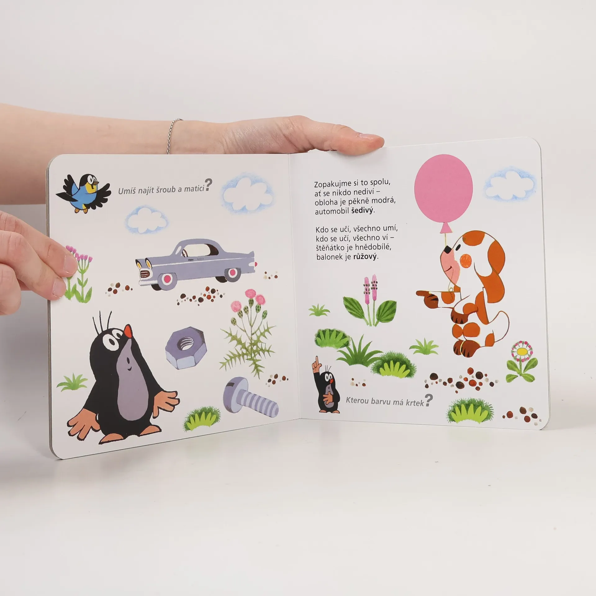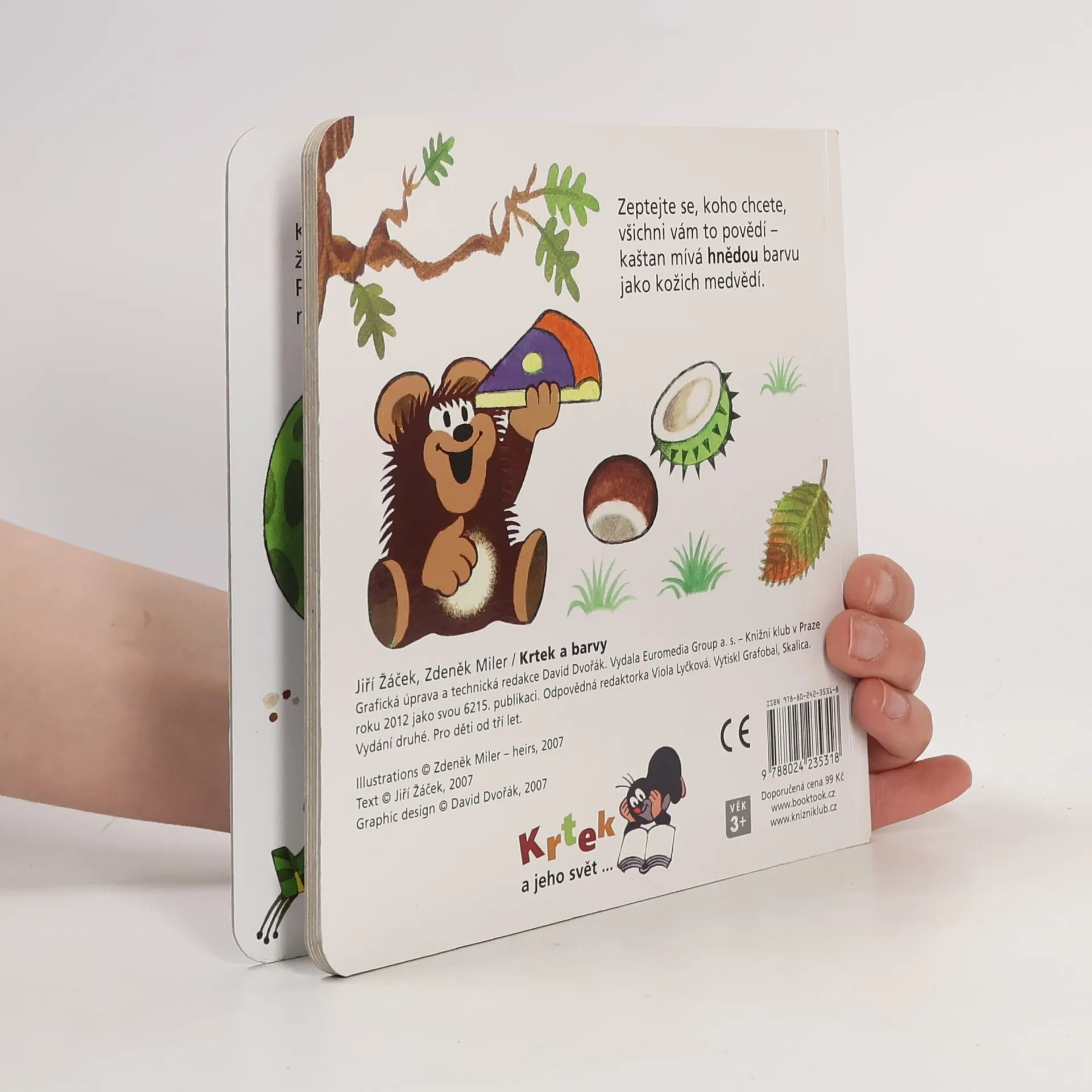 Čtvrtý svazek poznávací řady leporel zavede nejmenší čtenáře do světa barev. S hravými obrázky Zdeňka Milera a jednoduchými vtipnými verši Jiřího Žáčka se děti naučí rozlišovat jednotlivé barvy, které nás obklopují. Učitelem v této škole pro nejmenší je oblíbený Krteček, který si připravil - společně s pejskem, žabkou, mravenečkem, zajícem, medvědem a dalšími kamarády - pro své malé žáčky zvídavé otázky.