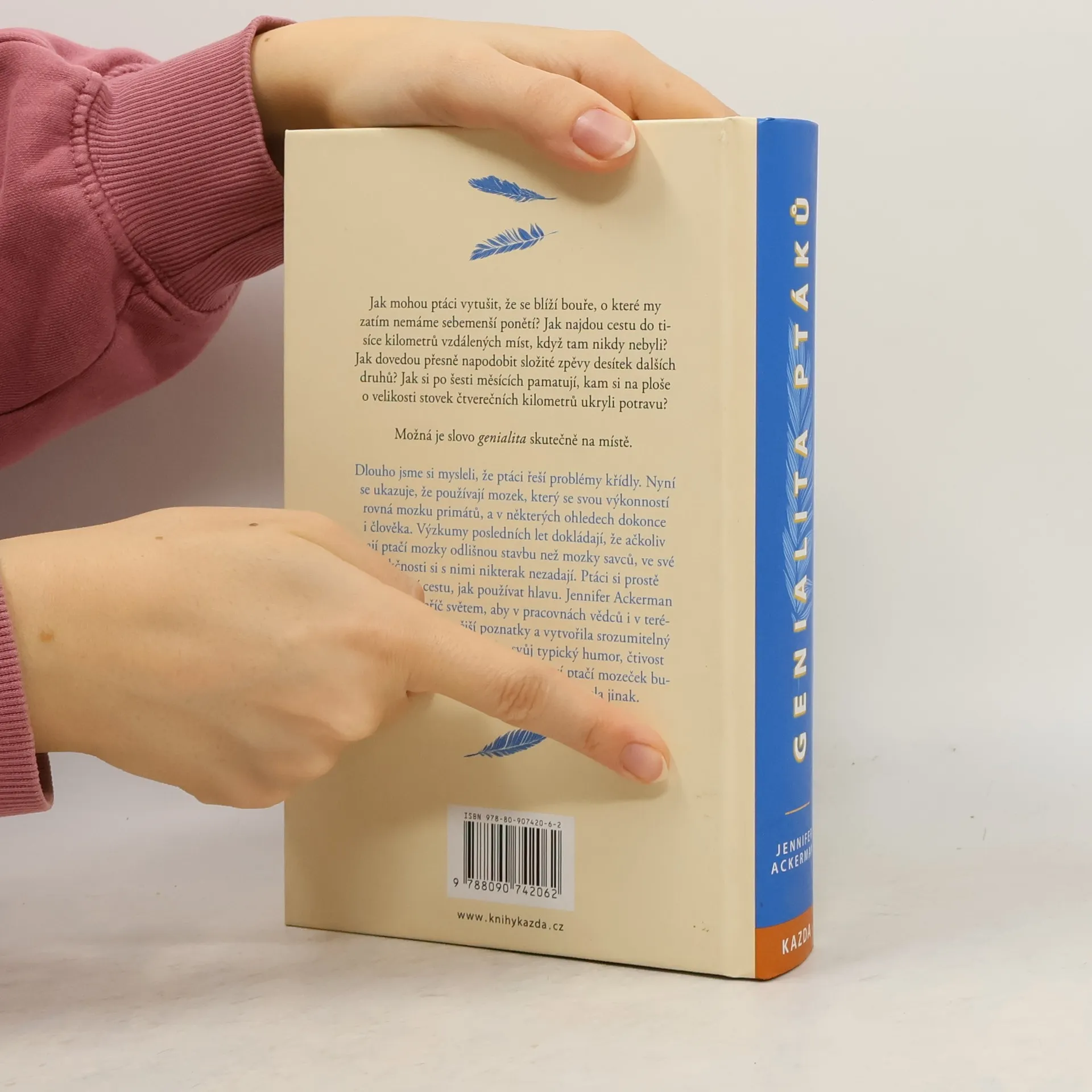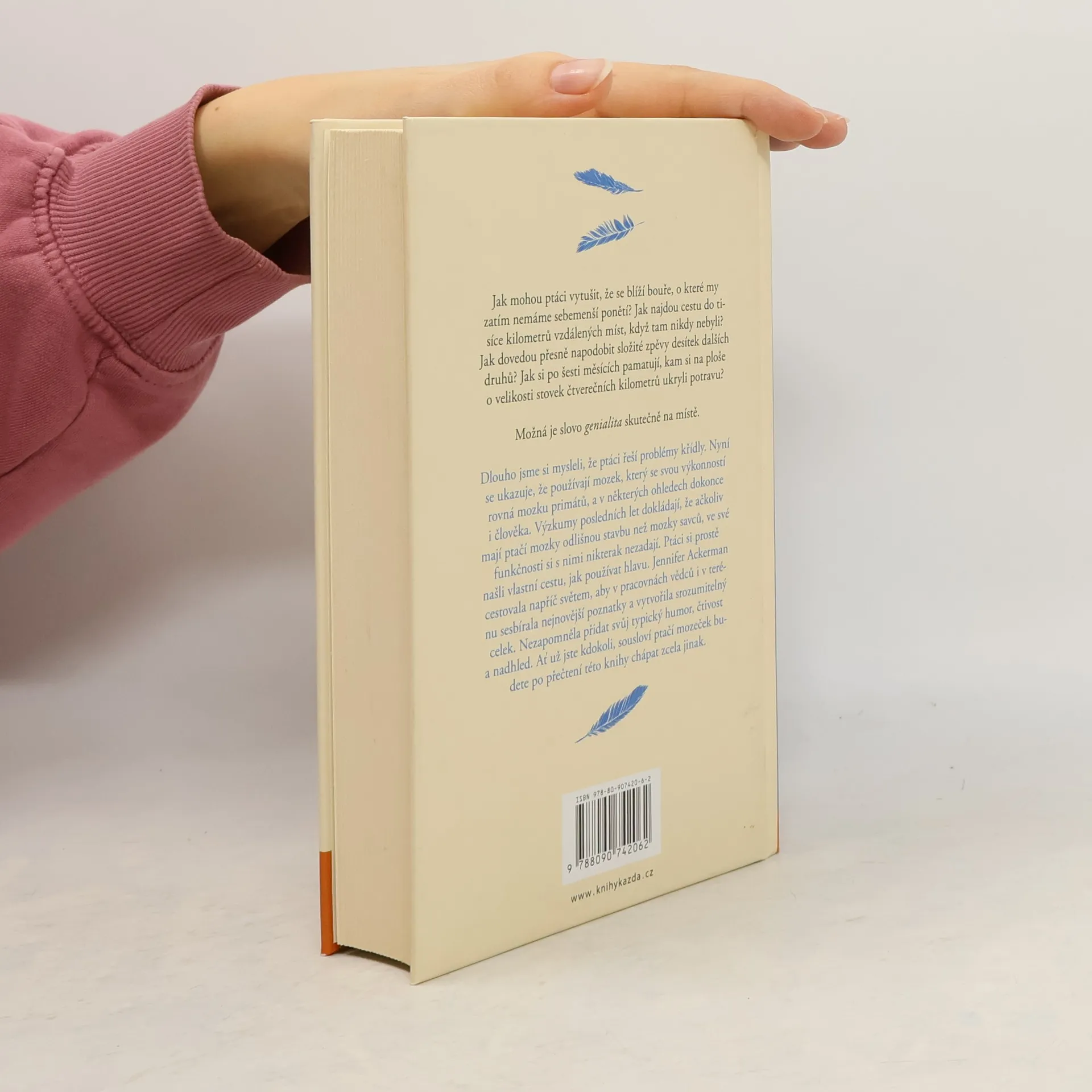 Jak mohou ptáci vytušit, že se blíží bouře, o které my zatím nemáme sebemenší ponětí? Jak najdou cestu do tisíce kilometrů vzdálených míst, když tam nikdy nebyli? Jak dovedou přesně napodobit složité zpěvy desítek dalších druhů? Jak si po šesti měsících pamatují, kam si na ploše o velikosti stovek čtverečních kilometrů ukryli potravu? Možná je slovo genialita skutečně na místě. Dlouho jsme si mysleli, že ptáci řeší problémy křídly. Nyní se ukazuje, že používají mozek, který se svou výkonností rovná mozku primátů, a v některých ohledech dokonce i člověka. Výzkumy posledních let dokládají, že ačkoliv mají ptačí mozky odlišnou stavbu než mozky savců, ve své funkčnosti si s nimi nikterak nezadají. Ptáci si prostě našli vlastní cestu, jak používat hlavu. Jennifer Ackerman cestovala napříč světem, aby v pracovnách vědců i v terénu sesbírala nejnovější poznatky a vytvořila srozumitelný celek. Nezapomněla přidat svůj typický humor, čtivost a nadhled. Ať už jste kdokoli, sousloví ptačí mozeček budete po přečtení této knihy chápat zcela jinak.