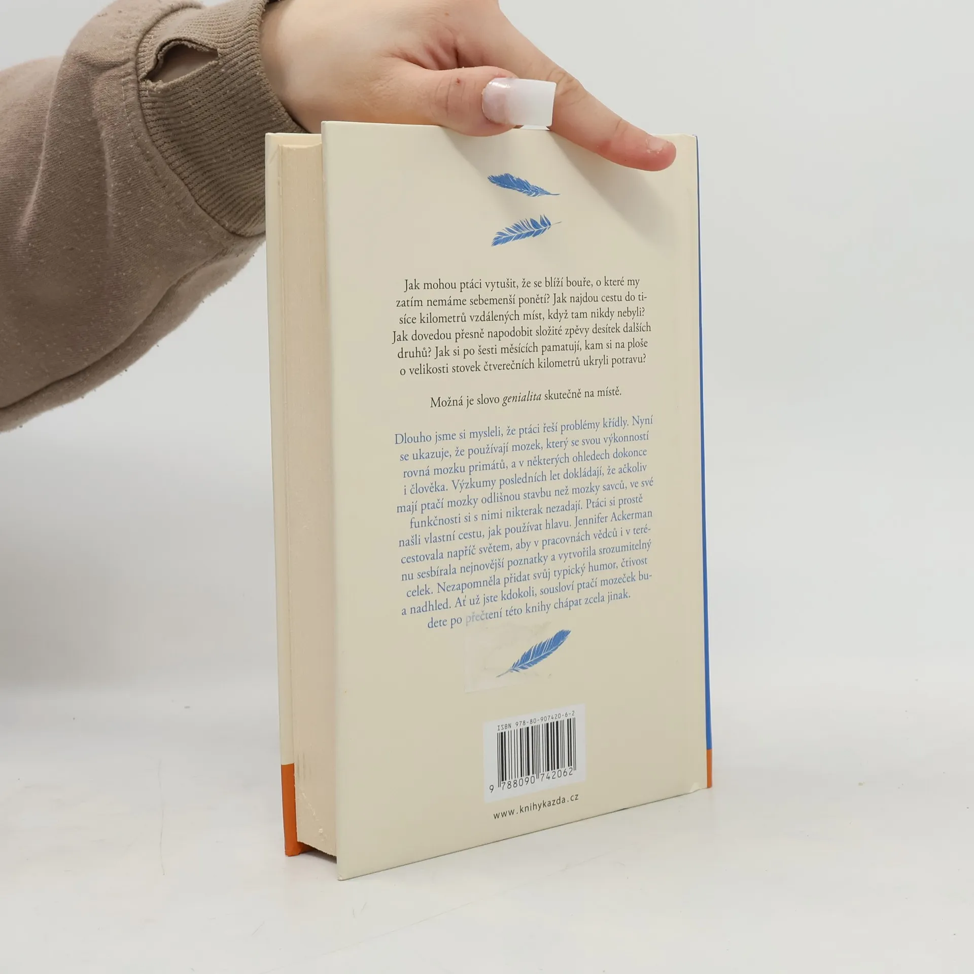 Jak mohou ptáci vytušit, že se blíží bouře, o které my zatím nemáme sebemenší ponětí? Jak najdou cestu do tisíce kilometrů vzdálených míst, když tam nikdy nebyli? Jak dovedou přesně napodobit složité zpěvy desítek dalších druhů? Jak si po šesti měsících pamatují, kam si na ploše o velikosti stovek čtverečních kilometrů ukryli potravu? Možná je slovo genialita skutečně na místě. Dlouho jsme si mysleli, že ptáci řeší problémy křídly. Nyní se ukazuje, že používají mozek, který se svou výkonností rovná mozku primátů, a v některých ohledech dokonce i člověka. Výzkumy posledních let dokládají, že ačkoliv mají ptačí mozky odlišnou stavbu než mozky savců, ve své funkčnosti si s nimi nikterak nezadají. Ptáci si prostě našli vlastní cestu, jak používat hlavu. Jennifer Ackerman cestovala napříč světem, aby v pracovnách vědců i v terénu sesbírala nejnovější poznatky a vytvořila srozumitelný celek. Nezapomněla přidat svůj typický humor, čtivost a nadhled. Ať už jste kdokoli, sousloví ptačí mozeček budete po přečtení této knihy chápat zcela jinak.