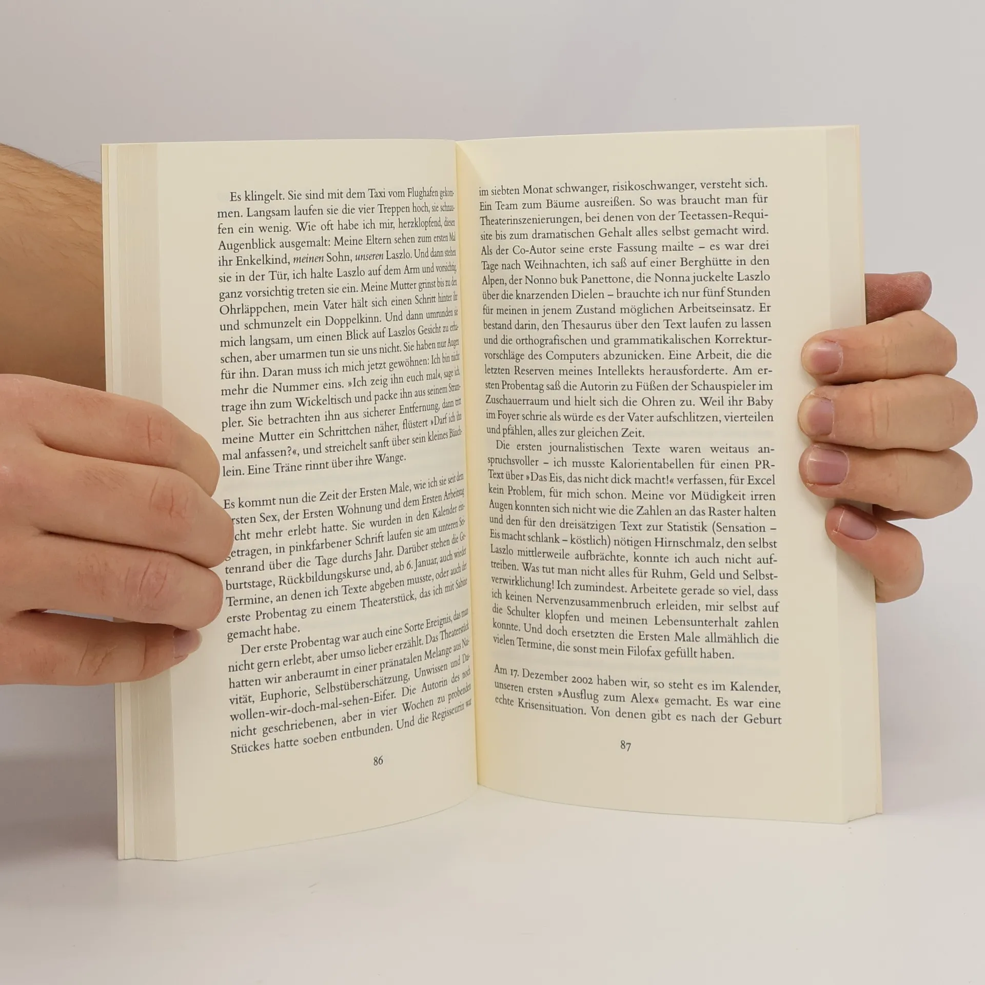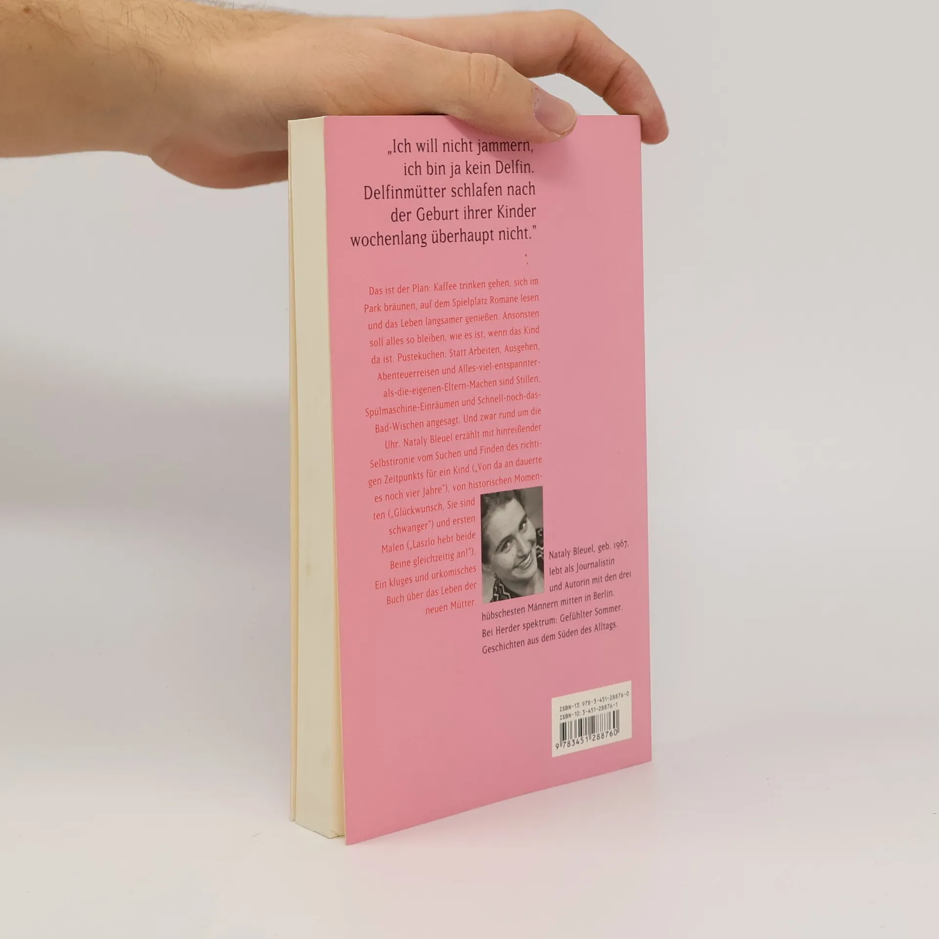 Das ist der Plan: Kaffee trinken gehen, sich im Park bräunen, auf dem Spielplatz Romane lesen und das Leben langsamer genießen. Ansonsten soll alles so bleiben, wie es ist, wenn das Kind da ist. Pustekuchen! Statt Arbeiten, Ausgehen, Abenteuerreisen und Alles-viel-entspannter-als-die-eigenen-Eltern-Machen sind Stillen, Spülmaschineeinräumen und Schnell-noch-das-Bad-Wischen angesagt. Und zwar rund um die Uhr. Nataly Bleuel erzählt mit hinreißender Selbstironie vom Suchen und Finden des perfekten Zeitpunkts für ein Kind („Von da an dauerte es noch viereinhalb Jahre“), von historischen Momenten („Glückwunsch, Sie sind schwanger“) und von ersten Malen („Eli hebt beide Beine gleichzeitig an!“). Ein kluges, genaues und unglaublich komisches Buch über das Leben der neuen Mütter: „Ich will nicht jammern, ich bin ja kein Delfin. Delfinmütter schlafen nach der Geburt ihrer Delfinkinder wochenlang überhaupt nicht“.