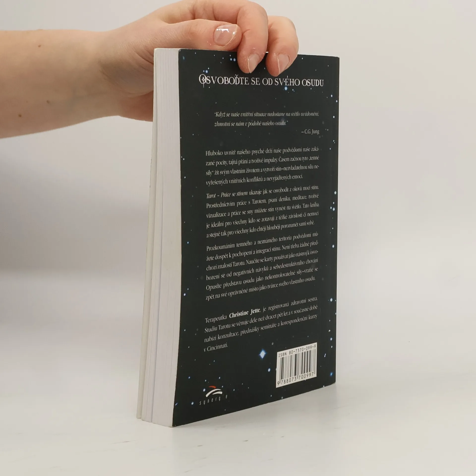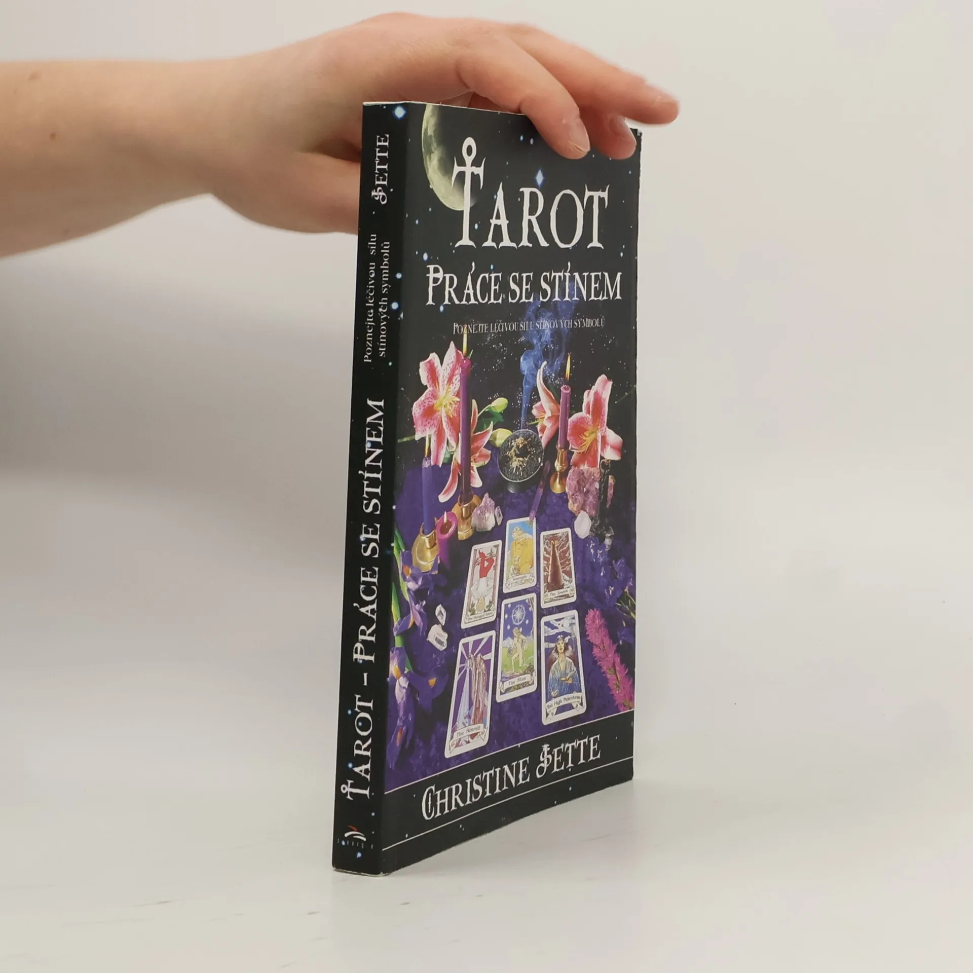 Hluboko uvnitř našeho psyché drží naše podvědomí naše zakázané pocity, tajná přání a tvořivé impulzy. Časem začnou tyto "temné síly" žít svým vlastním životem a vytvoří stín - nezvladatelnou sílu nevyřešených vnitřních konfliktů a nevyjádřených emocí. Kniha ukazuje jak se osvobodit z okovů moci stínu. Prostřednictvím práce s Tarotem, psaní deníku, meditace, tvořivé vizualizace a práce se sny, můžeme stín vynést na světlo. Tato kniha je ideální pro všechny kdo se zotavují z těžké závislosti či nemoci a stejně tak pro všechny kdo chtějí hlouběji porozumět sami sobě. Prozkoumáním temného a neznámého teritoria podvědomí můžete dospět k pochopení a integraci stínu. Není třeba žádné předchozí znalosti Tarotu. Naučíte se karty používat jako nástroj k osvobození se od negativních návyků a sebedestruktivního chování. Opusťte představu osudu jako nekontrolovatelné síly — vraťte se zpět na své oprávněné místo jako tvůrce svého vlastního osudu. Terapeutka Christine Jette, je registrovaná zdravotní sestra. Studiu Tarotu se věnuje déle než dvacet pět let a v současné době nabízí konzultace, přednášky semináře a korespondenční kurzy v Cincinnati. Obsah: Část I.: Stín to ví; Část II.: Do světla; Část III.: Hvězdní průvodci; Dodatek B; Dodatek C