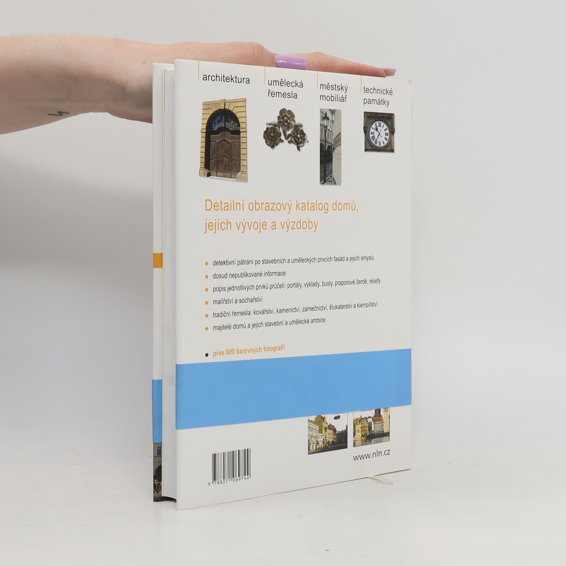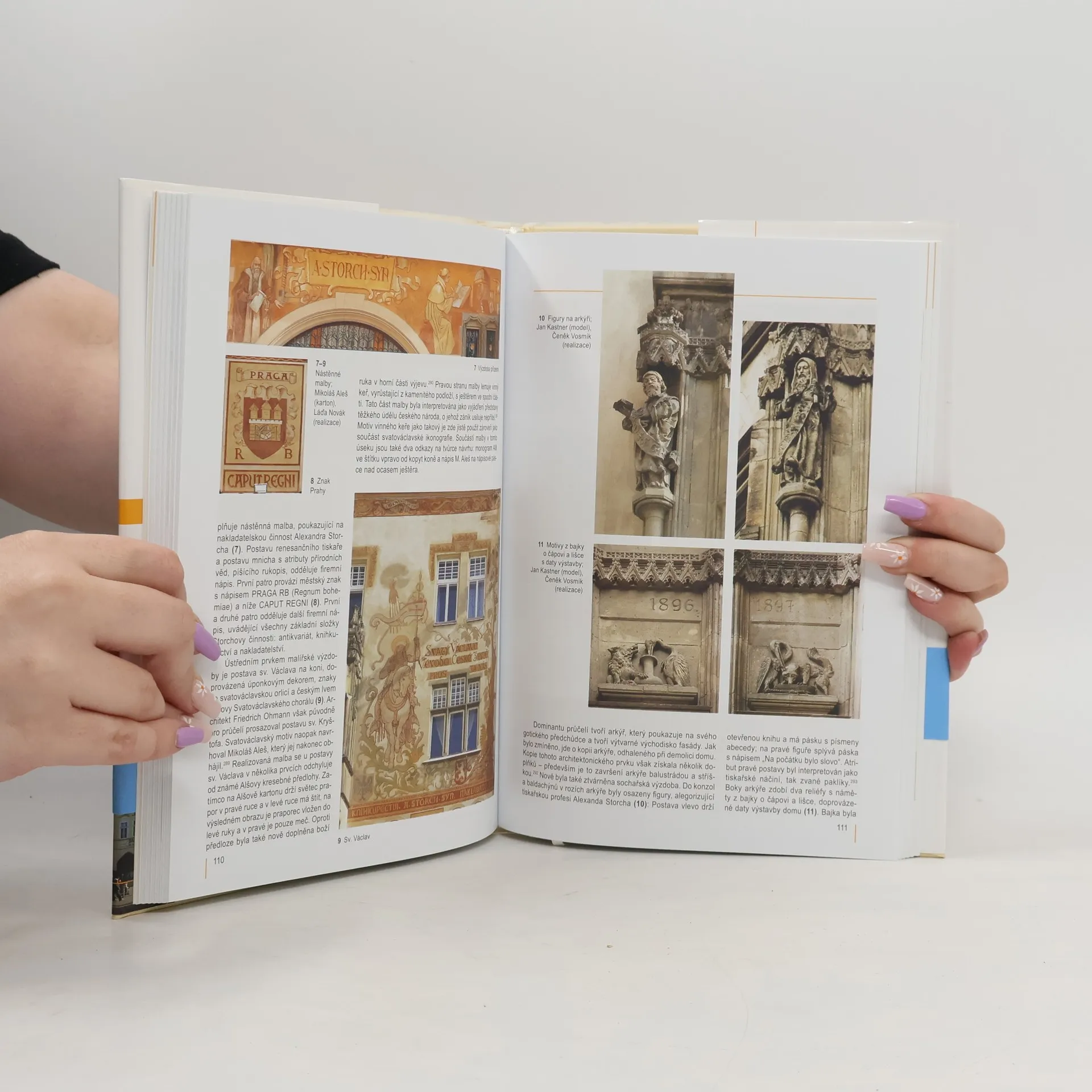 Detektivní pátrání po stavebních a uměleckých prvcích fasád a jejich smyslu · dosud nepublikované informace · popis jednotlivých prvků průčelí: portály, výklady, busty, praporové žerdě, reliéfy · malířství a sochařství · tradiční řemesla: kovářství, kamenictví, zámečnictví, štukatérství a klempířství · majitelé domů a jejich stavební a umělecké publikace. // Autoři se soustředí na Staroměstské náměstí a jeho bezprostřední okolí, tzn. na Malé náměstí, ul. U Radnice a ul. Mikulášská.