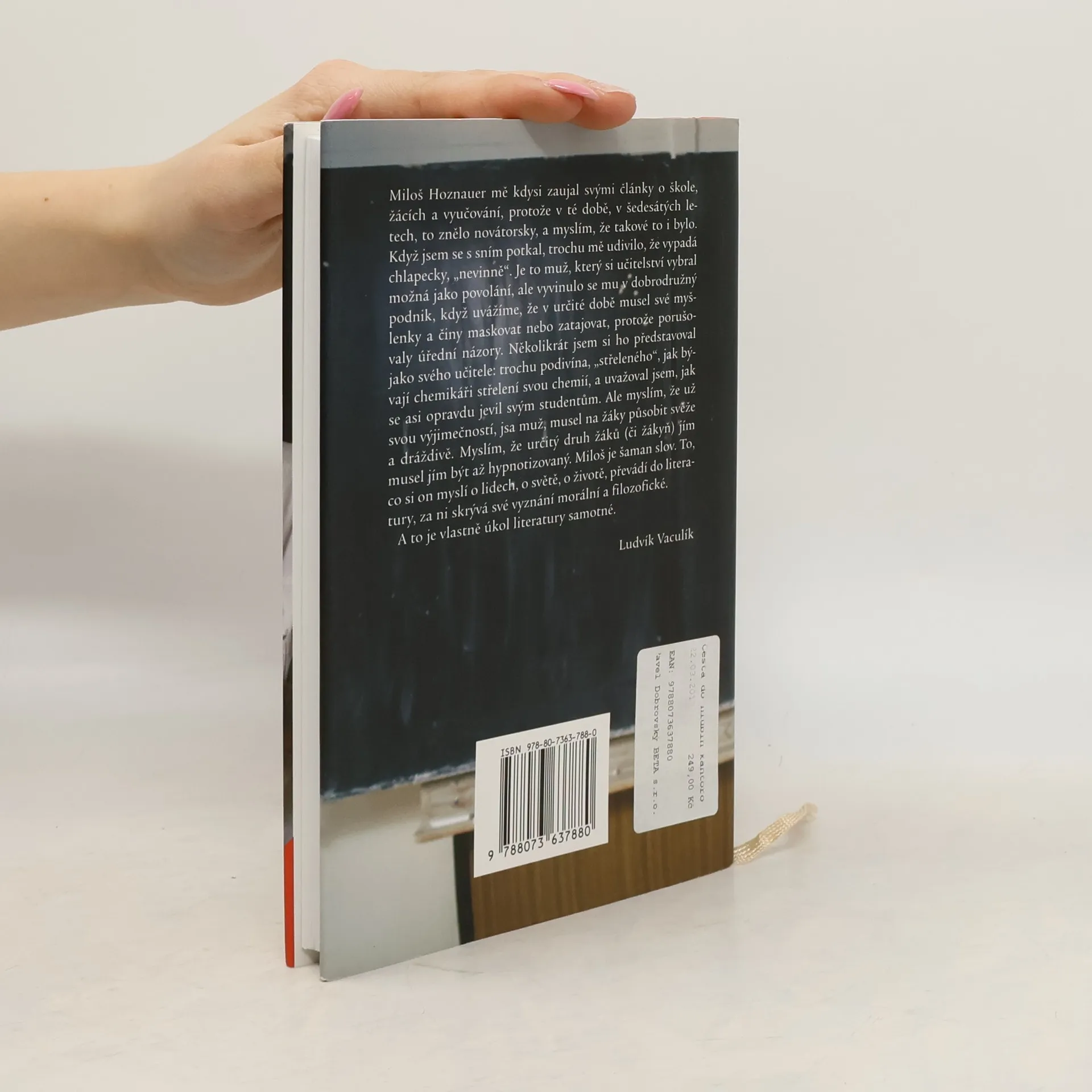 Miloš Hoznauer bývá označován za živoucí legendu pražských češtinářů – kantorské povolání si zvolil na maturitním večírku jaksi z recese, ale stalo se mu celoživotním údělem. Dodnes k němu ale má zvláštní vztah. Na jedné straně souhlasí se sloganem „jsem kantor, kdo je míň“, ale na druhé straně by ani dnes jinak nevolil. A jak učil? Svou učitelskou práci vždy pojímal jako jedno velké divadelní představení: vstoupil do třídy, opona se rozhrnula a představení mohlo začít. A čím více se ho účastnilo i publikum, tím lépe... Z jeho pedagogického působení vychází i tato kniha. Není jen pouhým sledem nejrůznějších školních historek, včetně autorových vlastních trapasů a pedagogických poklesků, ale i humorně podaným obrazem našeho těžce zkoušeného školství v posledním půlstoletí. A protože jako češtinář a literární historik prožil Hoznauer život spojený s literaturou, najdeme zde i mnohé její proměny v tomto období. Každý čtenář poznal školu na vlastní kůži, muže tedy Hoznauerovy postřehy srovnávat s osobní zkušeností. Možná však leckoho překvapí, co všechno se ve škole dá prožít a že kantorské povolání může být i velmi tvořivé a dobrodružné…