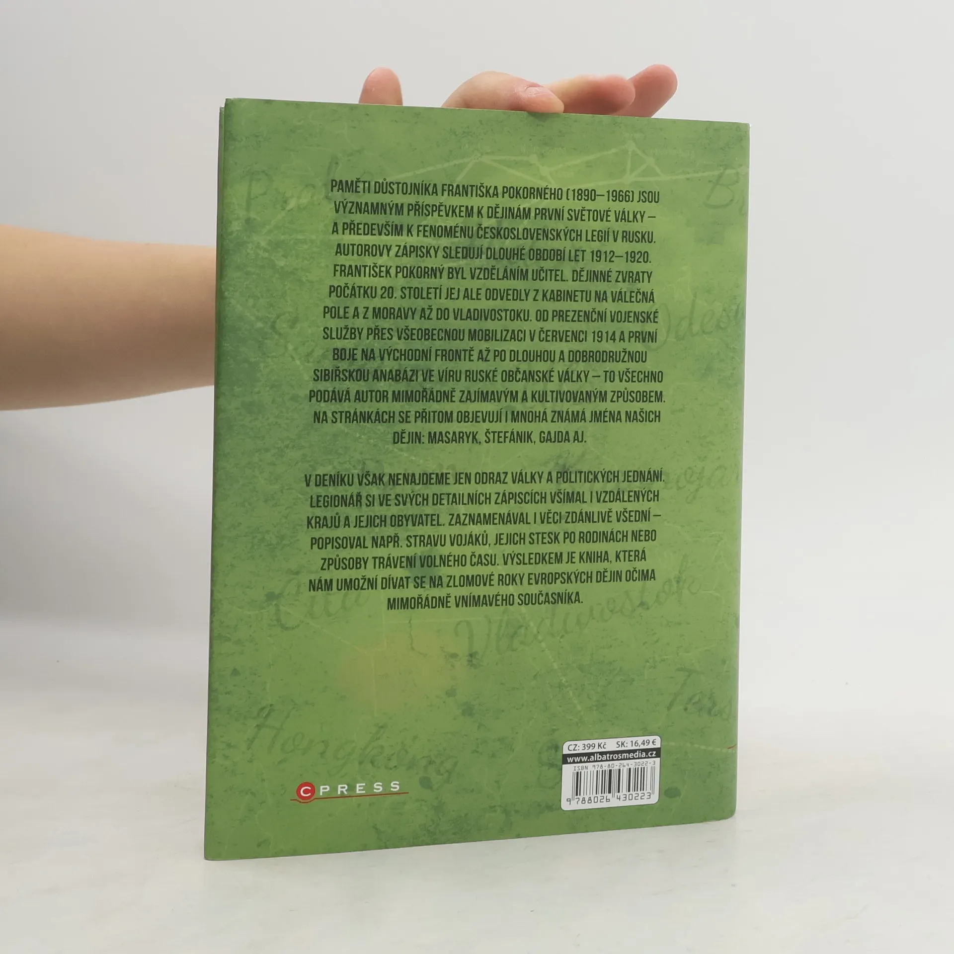 Vzpomínky na vojenskou a válečnou službu 1912–1920. Paměti důstojníka Františka Pokorného (1890–1966) jsou významným příspěvkem k dějinám první světové války – a především k fenoménu československých legií v Rusku. Autorovy zápisky sledují dlouhé období let 1912–1920. František Pokorný byl vzděláním učitel. Dějinné zvraty počátku 20. století jej ale odvedly z kabinetu na válečná pole a z Moravy až do Vladivostoku. Od prezenční vojenské služby přes všeobecnou mobilizaci v červenci 1914 a první boje na východní frontě až po dlouhou a dobrodružnou sibiřskou anabázi ve víru ruské občanské války – to všechno podává autor mimořádně zajímavým a kultivovaným způsobem. Na stránkách se přitom objevují i mnohá známá jména našich dějin: Masaryk, Štefánik, Gajda aj. V deníku však nenajdeme jen odraz války a politických jednání. Legionář si ve svých detailních zápiscích všímal i vzdálených krajů a jejich obyvatel. Zaznamenával i věci zdánlivě všední – popisoval např. stravu vojáků, jejich stesk po rodinách nebo způsoby trávení volného času. Výsledkem je kniha, která nám umožní dívat se na zlomové roky evropských dějin očima mimořádně vnímavého současníka.