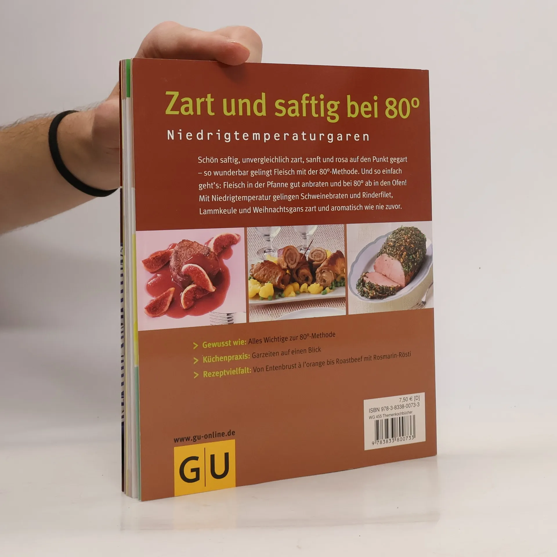 Schön saftig, unvergleichlich zart und garantiert sanft auf den Punkt gegart: so wunderbar schmeckt Fleisch und Geflügel nach der 80-Grad-Methode. Und so einfach geht es: Fleisch gut anbraten, im Backofen bei 80 Grad je nach Rezept schonend garen und nach Ende der Garzeit sofort servieren. Und sollten die Gäste sich verspäten macht eine halbe Stunde, die das Fleisch länger im Ofen bleibt, gar nichts. Mit Niedertemperatur gelingen große Braten, wie Schweineschulter und Lammkeule, edle Stücke, wie Rinderfilet und Lende oder kleine Stücke wie Hühnchenbrust und Kalbsrouladen ganz bestimmt. Und während das Fleisch im Ofen ist, haben Sie Zeit für das Drumherum, für sich, Ihre Gäste und Ihre Familie. Mit vielen originellen Extra-Saucen- und Beilagen-Rezepten. Und alle werden begeistert sein!