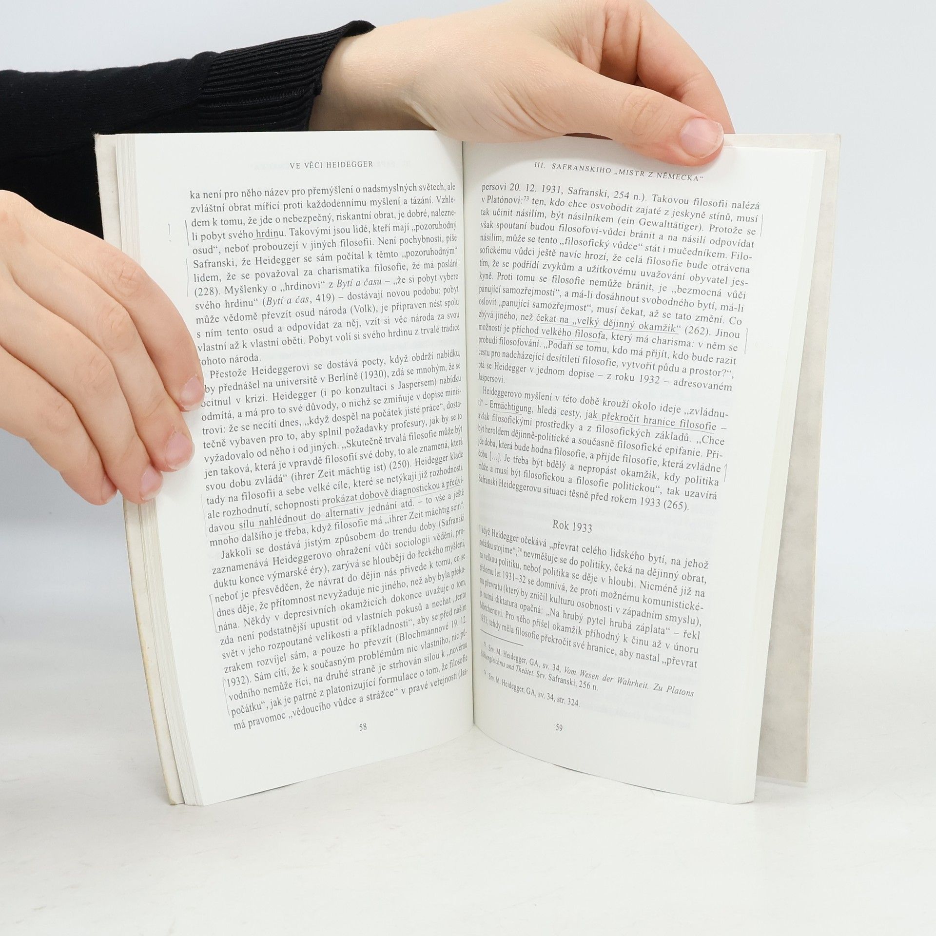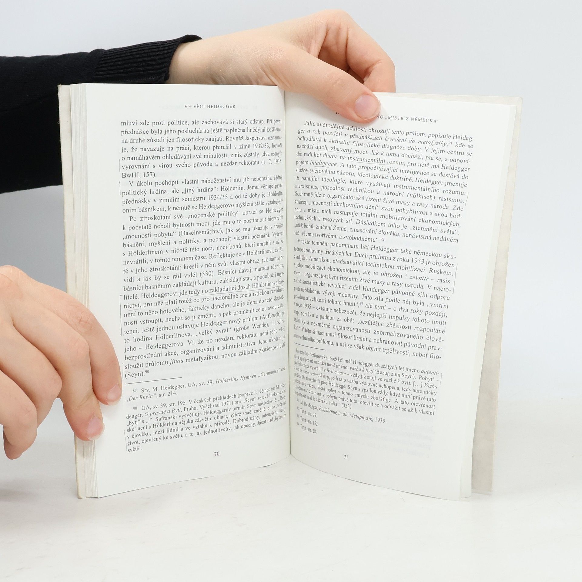 Fariasovo ”skandální odhalení” Heideggerova nacismu vyvolalo polemiky, o nichž kniha pojednává a dospívá k závěru, že teprve korektní a korigující biografie Rüdigera Safranskiho uvádí na pravou míru souvislosti životní a myšlenkové cesty M. Heideggera.