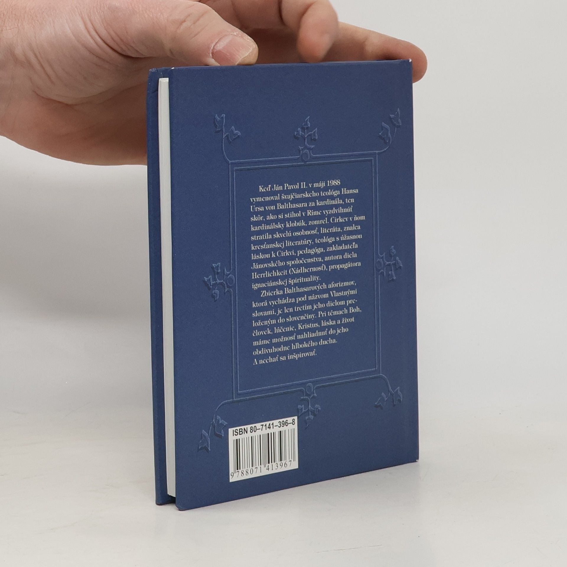 Keď Ján Pavol II. v máji 1988 vymenoval švajčiarskeho teológa Hansa Ursa von Balthasara za kardinála, ten skôr, ako si stihol v Ríme vyzdvihnúť kardinálsky klobúk, zomrel. Cirkev v ňom stratila skvelú osobnosť, literáta, znalca kresťanskej literatúry, teológa s úžasnou láskou k Cirkvi, pedagóga, zakladateľa Jánovského spoločenstva, autora diela Herrlichkeit (Nádhernosť), propagátora ignaciánskej špirituality. Zbierka Balthasarových aforizmov, ktorá vychádza pod názvom Vlastnými slovami, je len tretím jeho dielom preloženým do slovenčiny. Pri témach Boh, človek, lúčenie, Krisus, láska a život máme možnosť nahliadnuť do jeho obdivuhodne hlbokého ducha. A nechať sa inšpirovať.