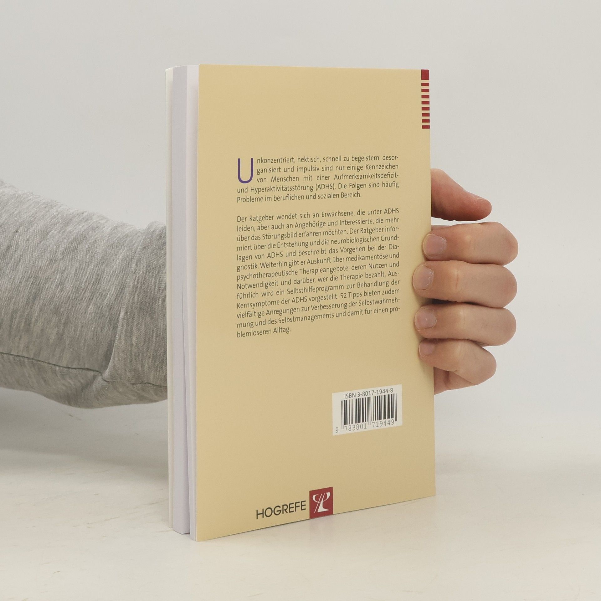 Unkonzentriert, hektisch, schnell zu begeistern, desorganisiert und impulsiv sind nur einige Kennzeichen von Menschen mit einer Aufmerksamkeitsdefizit- und Hyperaktivitätsstörung (ADHS). Die Folgen sind häufig Probleme im beruflichen und sozialen Bereich. Der Ratgeber wendet sich an Erwachsene, die unter ADHS leiden, aber auch an Angehörige und Interessierte, die mehr über das Störungsbild erfahren möchten. Der Ratgeber informiert über die Entstehung und die neurobiologischen Grundlagen von ADHS und beschreibt das Vorgehen bei der Diagnostik. Weiterhin gibt er Auskunft über medikamentöse und psychotherapeutische Therapieangebote, deren Nutzen und Notwendigkeit und darüber, wer die Therapie bezahlt. Ausführlich wird ein Selbsthilfeprogramm zur Behandlung der Kernsymptome der ADHS vorgestellt. 52 Tipps bieten zudem vielfältige Anregungen zur Verbesserung der Selbstwahrnehmung und des Selbstmanagements und damit für einen problemloseren Alltag.