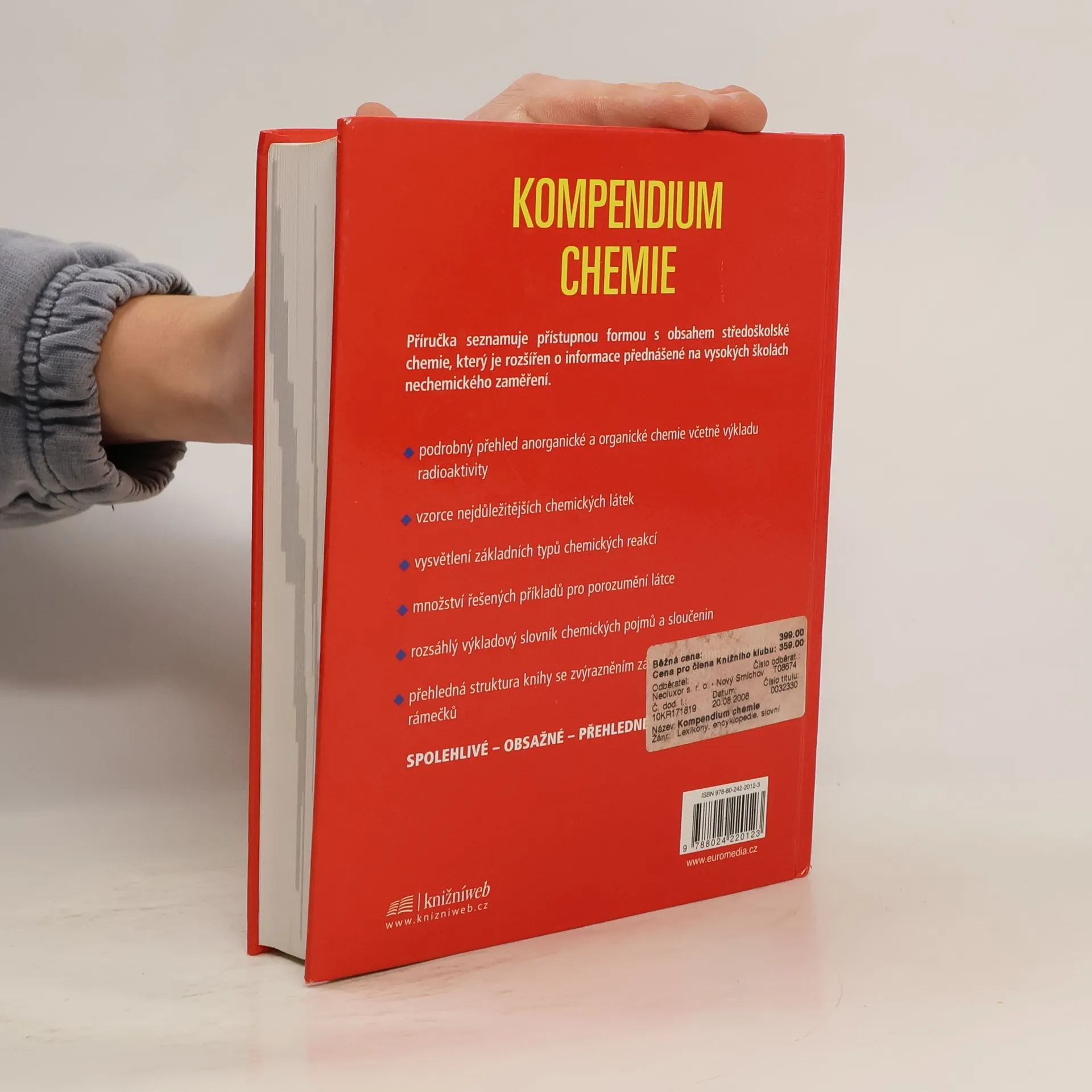 Příručka seznamuje přístupnou formou s obsahem středoškolské chemie, který je rozšířen o informace přednášené na vysokých školách nechemického zaměření. - podrobný přehled anorganické a organické chemie včetně výkladu radioaktivity - vzorce nejdůležitějších chemických látek - množství řešených příkladů pro porozumění látce - rozsáhlý výkladový slovník chemických pojmů a sloučenin - přehledná struktura knihy se zvýrazněním zásadních informací pomocí rámečků