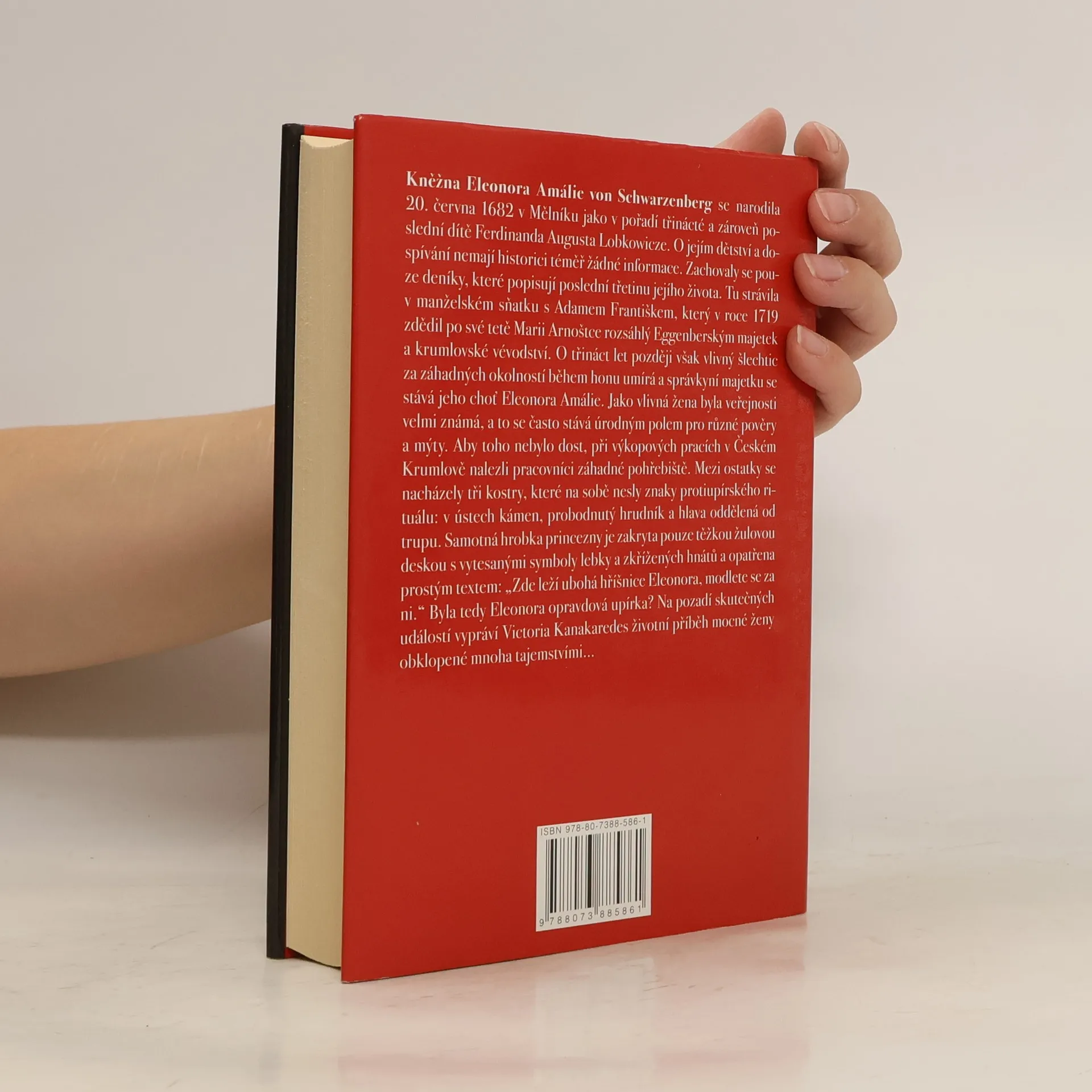 Kněžna Eleonora Amálie von Schwarzenberg se narodila 20. června 1682 v Mělníku jako v pořadí třinácté a zároveň poslední dítě Ferdinanda Augusta Lobkowitzce. O jejím dětství a dospívání nemají historici téměř žádné informace. Zachovaly se pouze deníky, které popisují poslední třetinu jejího života. Tu strávila v manželském sňatku s Adamem Františkem, který v roce 1719 zdědil po své tetě Marii Arnoštce rozsáhlý Eggenberským majetek a krumlovské vévodství. O třináct let později však vlivný šlechtic umírá a správkyní majetku se stává jeho choť Eleonora Amálie. Jako vlivná žena byla veřejnosti velmi známá, a to se často stává úrodným polem pro různé pověry a mýty. Aby toho nebylo dost, při výkopových pracích v Českém Krumlově nalezli pracovníci záhadné pohřebiště. Mezi ostatky se totiž nacházely tři kostry, které na sobě nesly znaky protiupírského rituálu: v ústech kamen, probodnutý hrudník a hlava oddělena od trupu… Byla tedy Eleonora opravdová upírka? Na pozadí skutečných událostí fabuluje Victoria Kanakaredes životní příběh ženy obklopené tajemstvím…