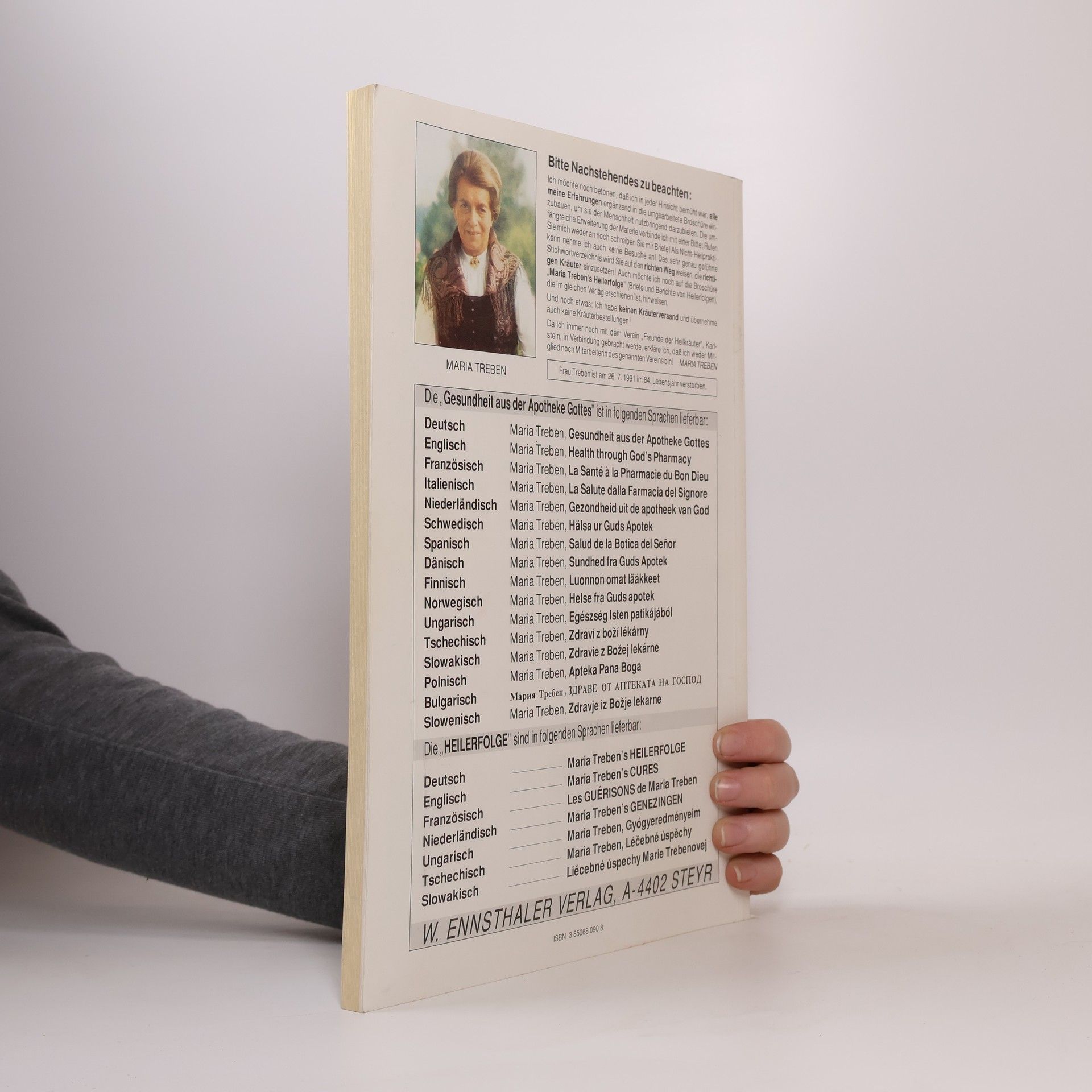 Das Hauptwerk Maria Trebens, die „Gesundheit aus der Apotheke Gottes“, ist 1980 im Ennsthaler Verlag erschienen und wurde bisher in 27 Sprachen übersetzt. Es werden 31 Heilkräuter, deren Heilkraft und Anwendungsmöglichkeiten als Tee, aufzulegender Brei, Bad oder Frischsaft ausführlich beschrieben. Maria Treben hat sich als eine der wichtigsten Pioniere der Kräuterheilkunde ihren Platz in der Geschichte erobert. Viele verehrten sie wie eine Heilige, tatsächlich war sie ein Frau, die sich ein Leben lang mit Heilkräutern beschäftigte und ihre Erfahrungen möglichst vielen Menschen nahebringen wollte. In all den Jahren hat ihre Popularität und die ihrer Werke nie nachgelassen. Ihre Bücher erleben heute durch die fortschreitende Anwendung der Alternativmedizin eine neue und ungebrochene Aktualität.