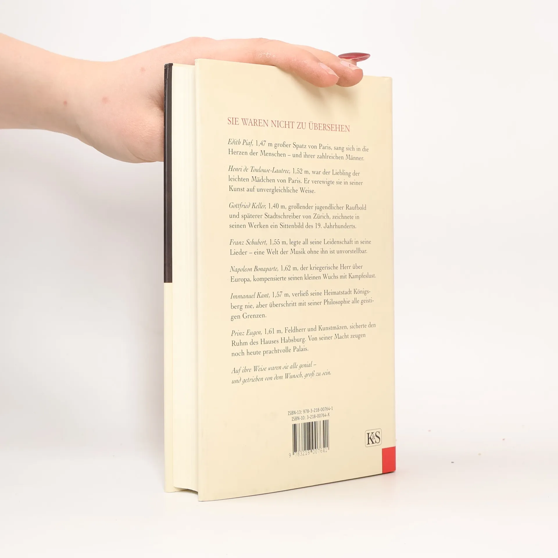 Faszinierende Porträts: Große Persönlichkeiten von kleinem Wuchs! Friedrich Weissensteiner, dessen Biografien berühmter Persönlichkeiten von einem breiten Publikum stets gerne gelesen werden, widmet sich in seinem neuen Buch klein gewachsenen Menschen, die Großes leisteten: Edith Piaf, Henri de Toulouse-Lautrec, Gottfried Keller, Franz Schubert, Napoleon Bonaparte, Immanuel Kant und Prinz Eugen. Er analysiert die psychologischen Eigenschaften erfolgreicher, klein gewachsener Menschen und erzählt auf packende Weise ihre Lebensgeschichte, berichtet von ihren Hoffnungen und Sehnsüchten, von ihren Siegen und Niederlagen und dem Großen, das sie geschaffen haben.