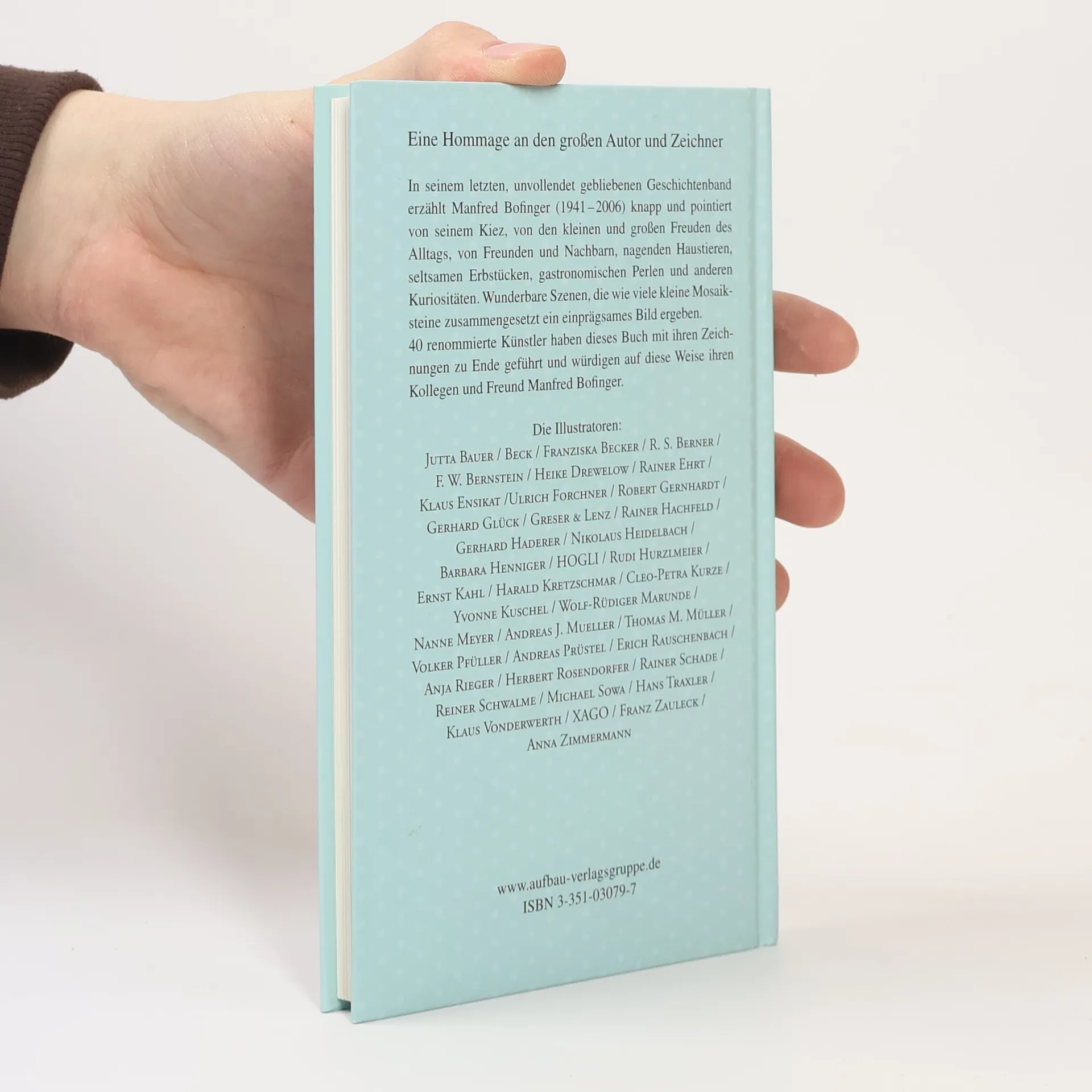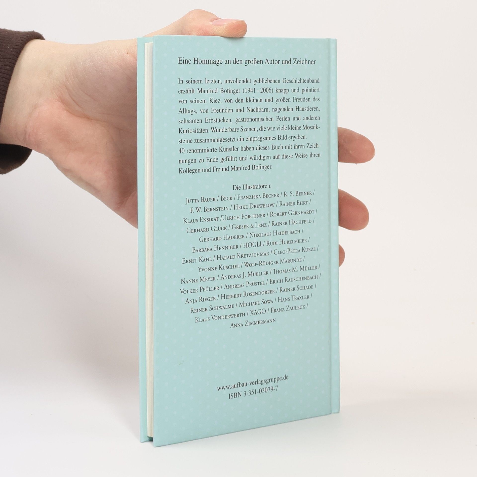 Renommierte Künstler, darunter Rotraut Susanne Berner, Klaus Ensikat, Robert Gernhardt, Michael Sowa, Hans Traxler, haben sich zusammengetan, um dieses Buch für Bofinger zu Ende zu führen.§§In seinem letzten, unvollendet gebliebenen Geschichtenband erzählt Manfred Bofinger in knappen und pointierten Sätzen von seinem Kiez, von den kleinen und großen Freuden des Alltags, von Freunden und Nachbarn, nagenden Haustieren, seltsamen Erbstücken, gastronomischen Perlen und anderen Kuriositäten. Und Bofinger, als präziser und ironischer Beobachter, ist immer mittendrin. Wunderbare Szenen und Begegnungen sind in dem Band enthalten. Es sind kleine Mosaiksteine, die zusammengesetzt ein einprägsames Bild ergeben. Mit ihren Illustrationen würdigen auf diese Weise 40 renommierte Künstler den Kollegen und Freund Manfred Bofinger.