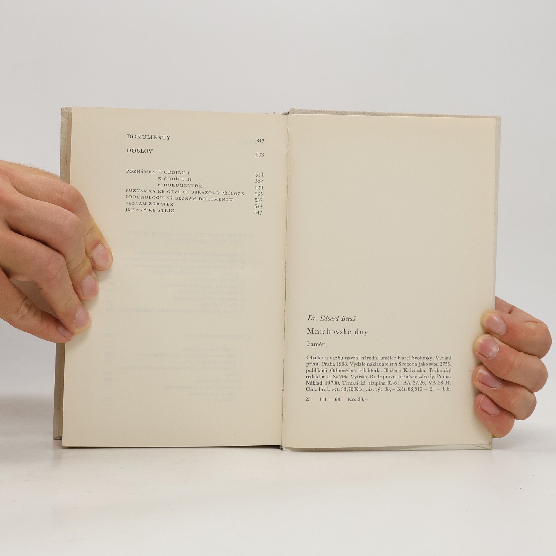 V historické literatuře se dnes hovoří o mnichovském komplexu dr. Beneše. Dr. Edvard Beneš si byl vědom své osobní odpovědnosti, a proto se k mnichovskému řešení ve své politické činnosti neustále vracel, promýšlel je a také je pro sebe i pro ostatní podrobně vylíčil. Šlo mu o to objasnit československou politiku, kterou jako president s vládou v roce 1938 a v letech předcházejících sledoval. Paměti dr. E. Beneše mají jistě svůj význam tím, že přinášejí řadu historických faktů, avšak především zaujmou způsobem výkladu a argumentace autora, jeho myšlenkovými pochody při hledání řešení situace, zejména v těch místech, kde píše o událostech, jichž byl přímým, a někdy dokonce jediným partnerským účastníkem, a o nichž nemohl tudíž nikdo jiný vědět víc… 25-111-68