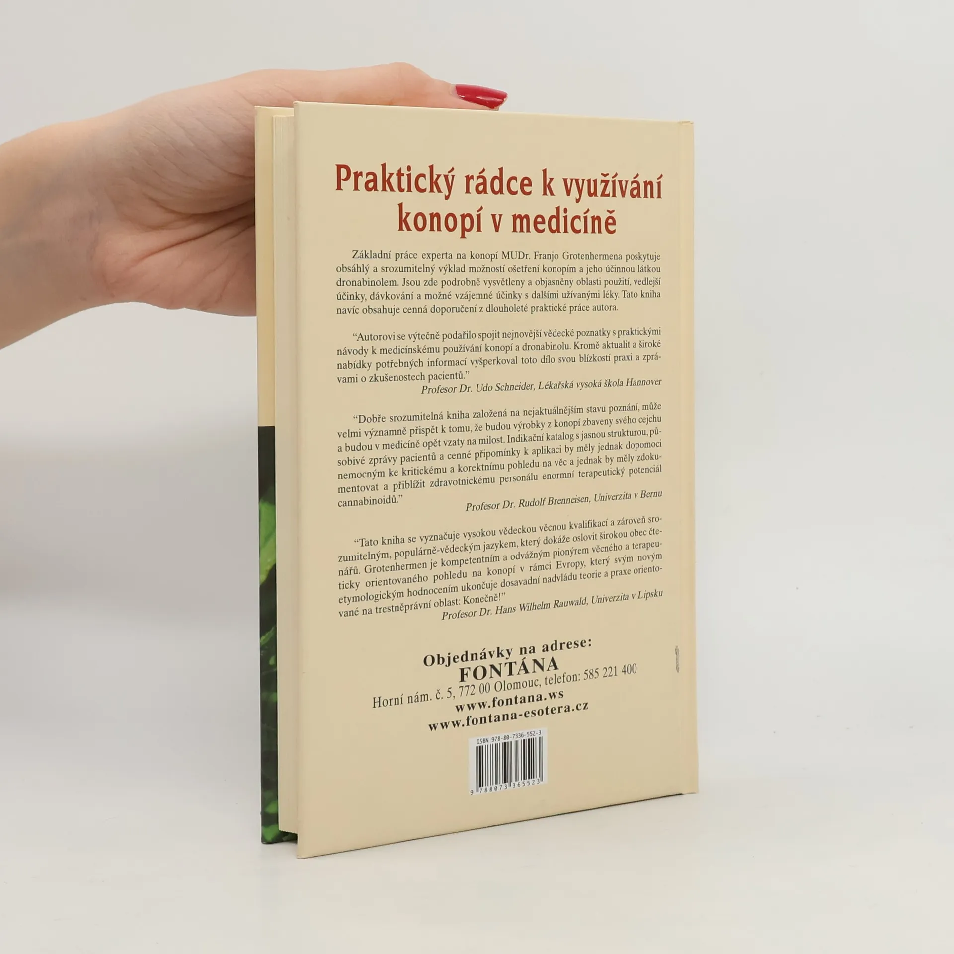 Základní práce experta na konopí MUDr. Franjo Grotenhermena poskytuje obsáhlý a srozumitelný výklad možností ošetření konopím a jeho účinno látkou dronabinolem. Jsou zde podrobně vysvětleny a objasněny oblasti použití, vedlejší účinky, dávkování a možné vzájemné účinky s dalšími užívanými léky. Tato kniha navíc obsahuje cenná doporučení z dlouholeté praxe autora.