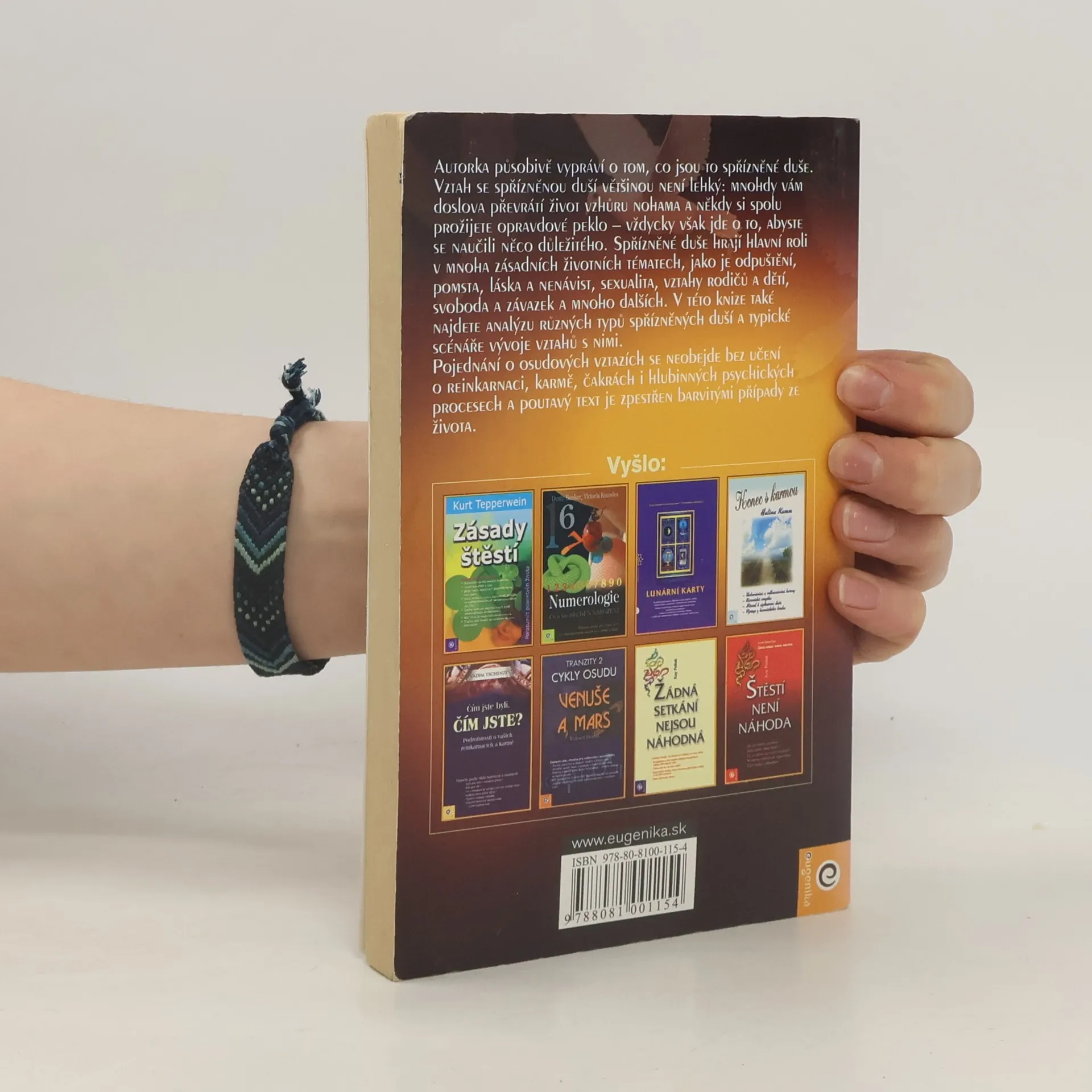Autorka působivě vypráví o tom, co jsou to spřízněné duše. Ty hrají hlavní roli v mnoha zásadních životních tématech, jako je odpuštění, pomsta, láska a nenávist, sexualita, vztahy rodič-dítě, svoboda a závazek a další. Rozebírají se zde různé typy spřízněných duší a typické scénáře vývoje vztahů s nimi. Poutavý text je zpestřen barvitými případy ze života.