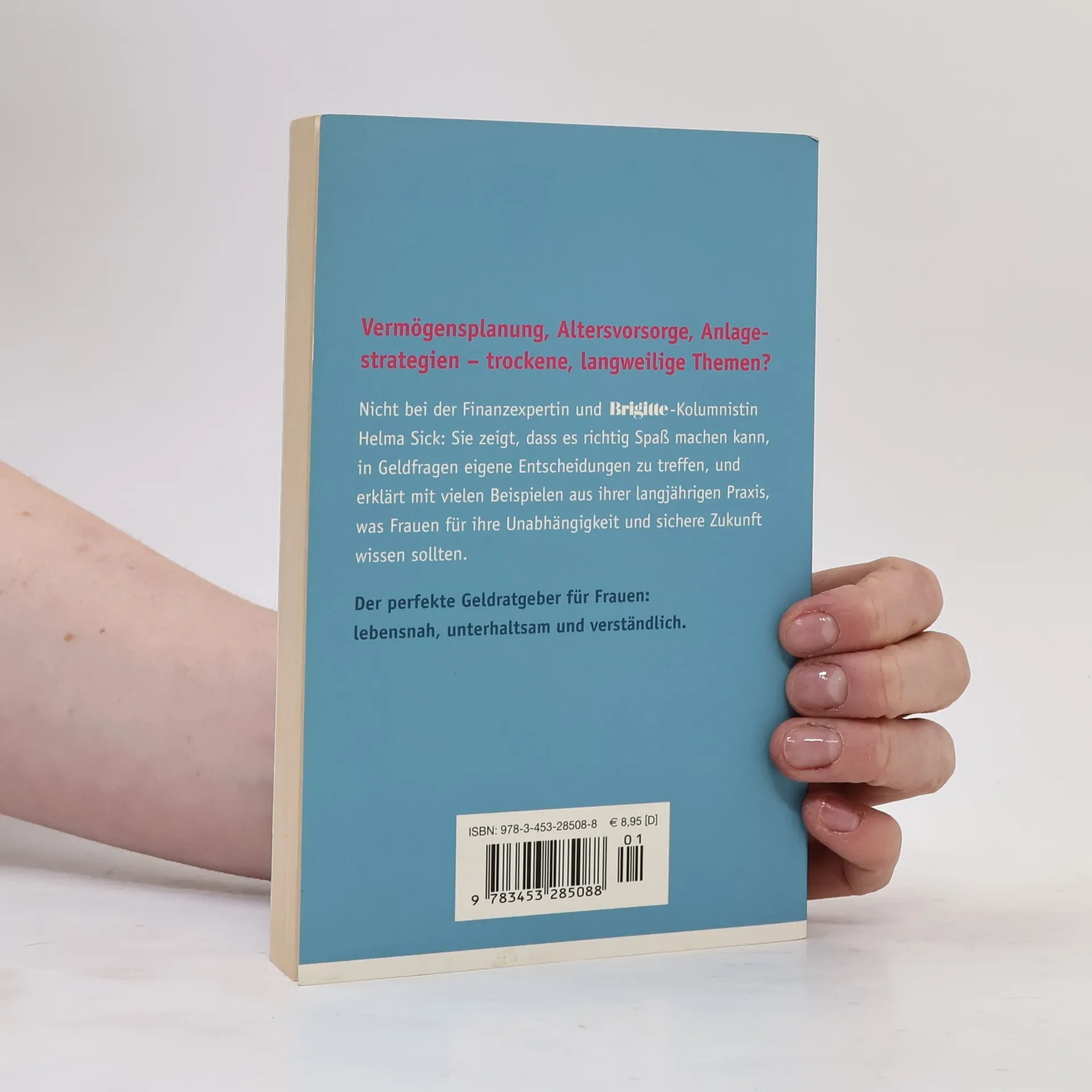 Jetzt in der 4. aktualisierten und überarbeiteten Auflage! Der perfekte Geld-Ratgeber für Frauen: lebensnah, unterhaltsam, leicht verständlich. Neu mit allen Informationen zur Abgeltungssteuer! Wenn’s ums Geld geht, überlassen Frauen immer noch zu viel den Männern. Vermögensplanung, Altersvorsorge, Anlagestrategien — trockene, langweilige Themen? Nicht bei der Finanzexpertin und BRIGITTE-Kolumnistin Helma Sick: Sie zeigt, dass es richtig Spaß machen kann, in Geldfragen eigene Entscheidungen zu treffen, und erklärt mit vielen Beispielen aus ihrer Praxis, was Frauen für ihre Unabhängigkeit und sichere Zukunft wissen sollten.