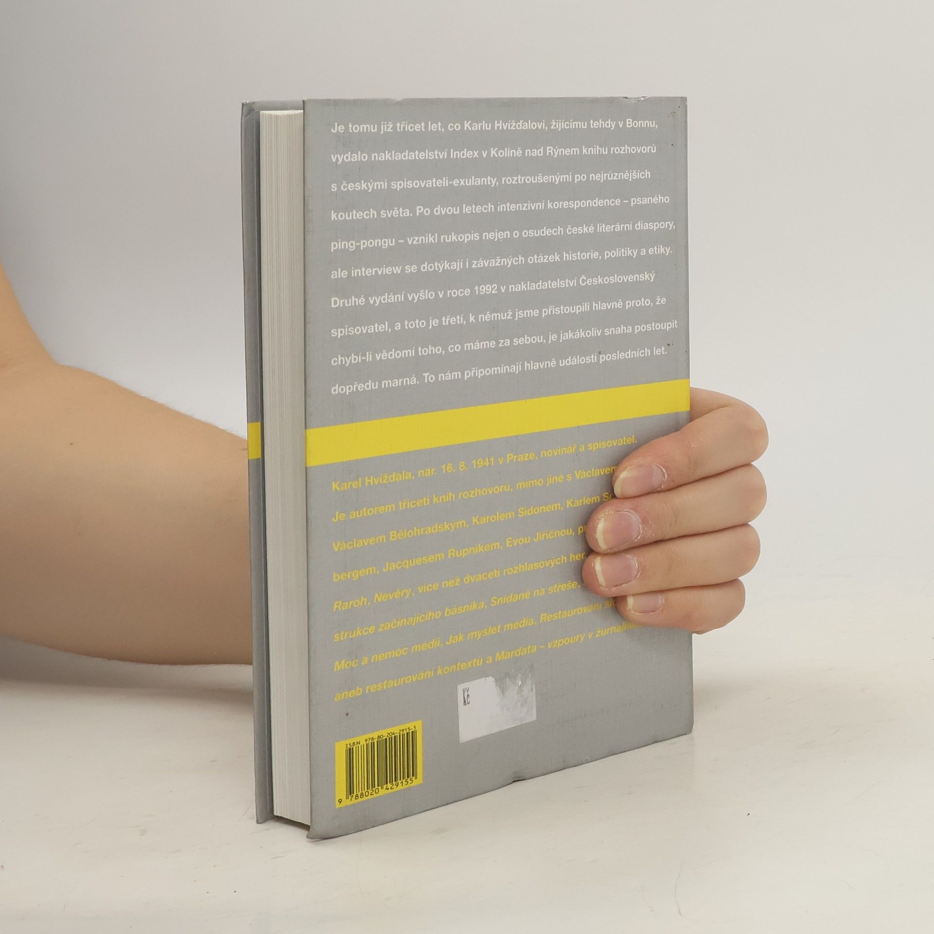 Karel Hvížďala již v 80. letech v exilu korespondoval s dvacítkou českých spisovatelů žijících v emigraci (mj. Kryl, Beneš, Filip, Aškenazy, Fischl, Listopad, Škvorecký, Škutina, Binar, Lustig, Hutka či Brousek). Během dvou let pomocí ping-pongu otázek a odpovědí dokázal vytvořit obraz české literární scény v zahraničí. Tato unikátní kniha vyšla u nás (kromě exilového vydání v r. 1981) pouze v roce 1992, od té doby sice několik autorů zemřelo, jiní byli oceněni různými vavříny. V každém případě tato výpověď generace velkých spisovatelů 2. poloviny 20. století neztratila nic na své aktuálnosti a poodhaluje čtenáři, jak se tito lidé, jejichž jazykem byla čeština, cítili v zahraničí, kde bohužel tento jazyk nemohli používat.