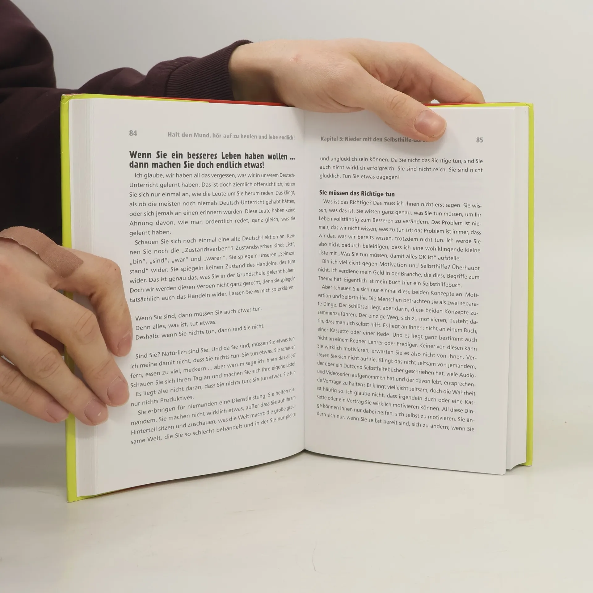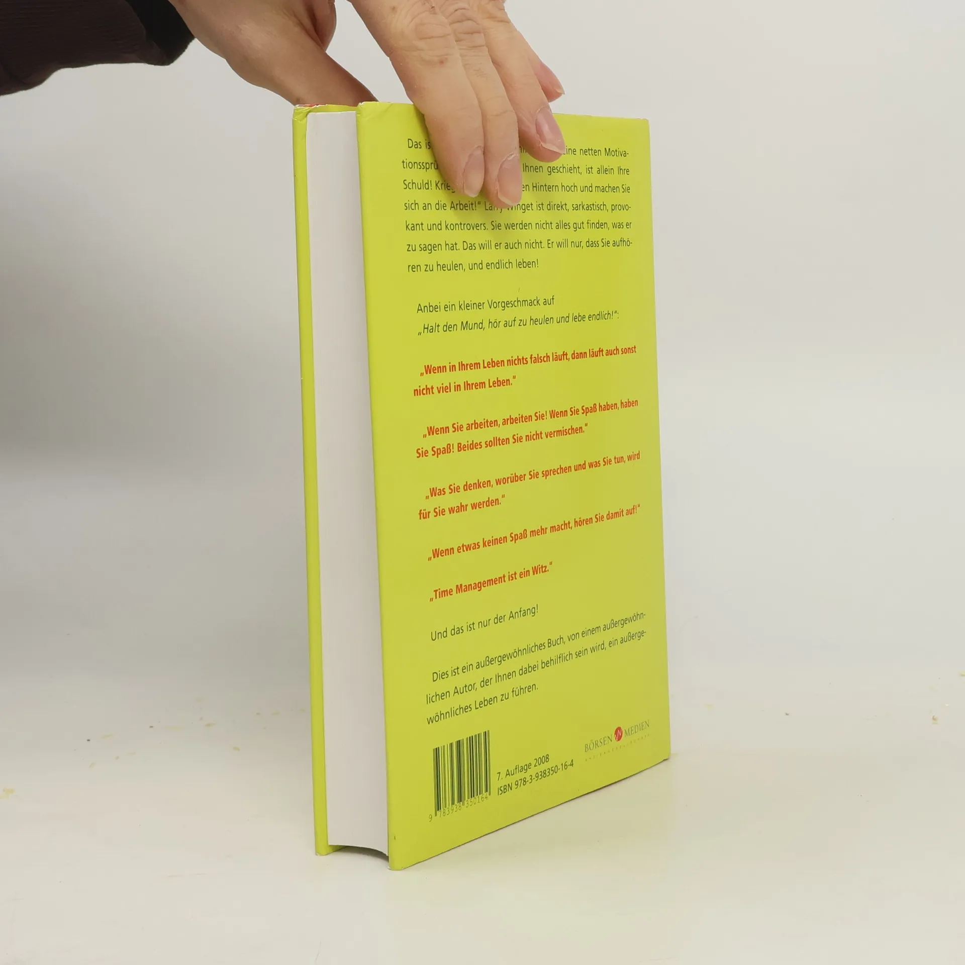 Achtung: Dieses Buch ist nichts für zartbesaitete Gemüter. Es besteht aus einer Artilleriesalve an Imperativen und ist ein verbaler Tritt in den Allerwertesten, mit dem erklärten Ziel, den Leser ordentlich wachzurütteln. Wessen Lebensgeister dieses Buch nicht weckt, der hat wahrscheinlich gar keine. (Und wenn es nur die Geister sind, die einen das Buch nach wenigen Seiten in die Ecke schleudern lassen ...) Larry Wingets Leitfaden führt quer durch die Lebensbereiche Ehe, Kinder, Fitness, Beruf, Freundschaft, Geld und Glück, wobei der Autor großzügig Schwänke aus seinem eigenen Leben mit einrührt. Ritter Winget ist zu einem wahren Kreuzzug aufgebrochen gegen Antriebslosigkeit, Ausreden und Menschen, die nicht bereit sind, die Verantwortung für ihr eigenes Leben zu übernehmen. Der Autor, der das Buch "dem ganzen Mist" gewidmet hat, der ihm jemals passiert ist, hinterfragt alles und jedes, lässt keine Entschuldigung zu und motiviert auf die beinharte Tour. Wer das Buch liest, wird Winget entweder lieben oder hassen. Und vielleicht sein Leben neu sortieren. getAbstract empfiehlt das Buch allen, die sich Veränderungen wünschen und der Karriere, der Partnerschaft oder gleich dem ganzen Leben neuen Schwung verleihen möchten
