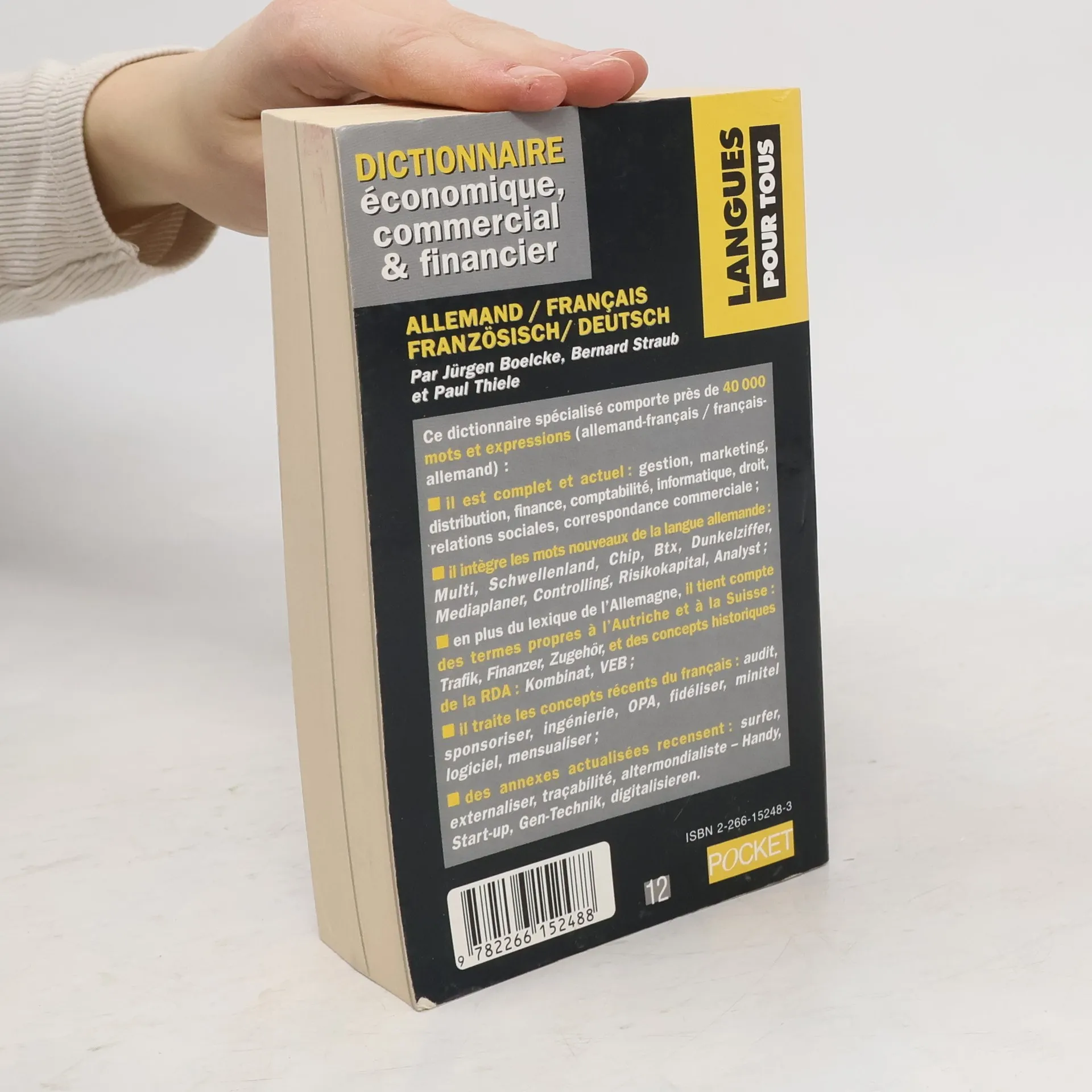 Ce dictionnaire spécialisé comporte près de 40 000 mots et expressions (allemand-français / français-allemand) : il est complet et actuel : gestion, marketing, distribution, finance, vomptabilité, informatique, droit, relations sociales, correspondance commerciale ; il intègre les nouveaux mots de la langue allemande : Multi, Schwellenland, Chip, Btx, Dunkelziffer, Mediaplaner, Controlling, Risikokapital, Analyst ; en plus du lexique de l'Allemagne, il tient compte des termes propres à l'Autriche et à la Suisse : Trafik, Finanzer, Zugehör, et des concepts historiques de la RDA : Kombinat, VEB ; il traite les concepts récents du français : audit, sponsoriser, ingénierie, OPA, fidéliser, minitel, logiciel, mensualiser ; des annexes actualisées recensent : surfer, externaliser, traçabilité, altermondialiste - Handy, Start-up, Gen-Technik, digitalisieren.