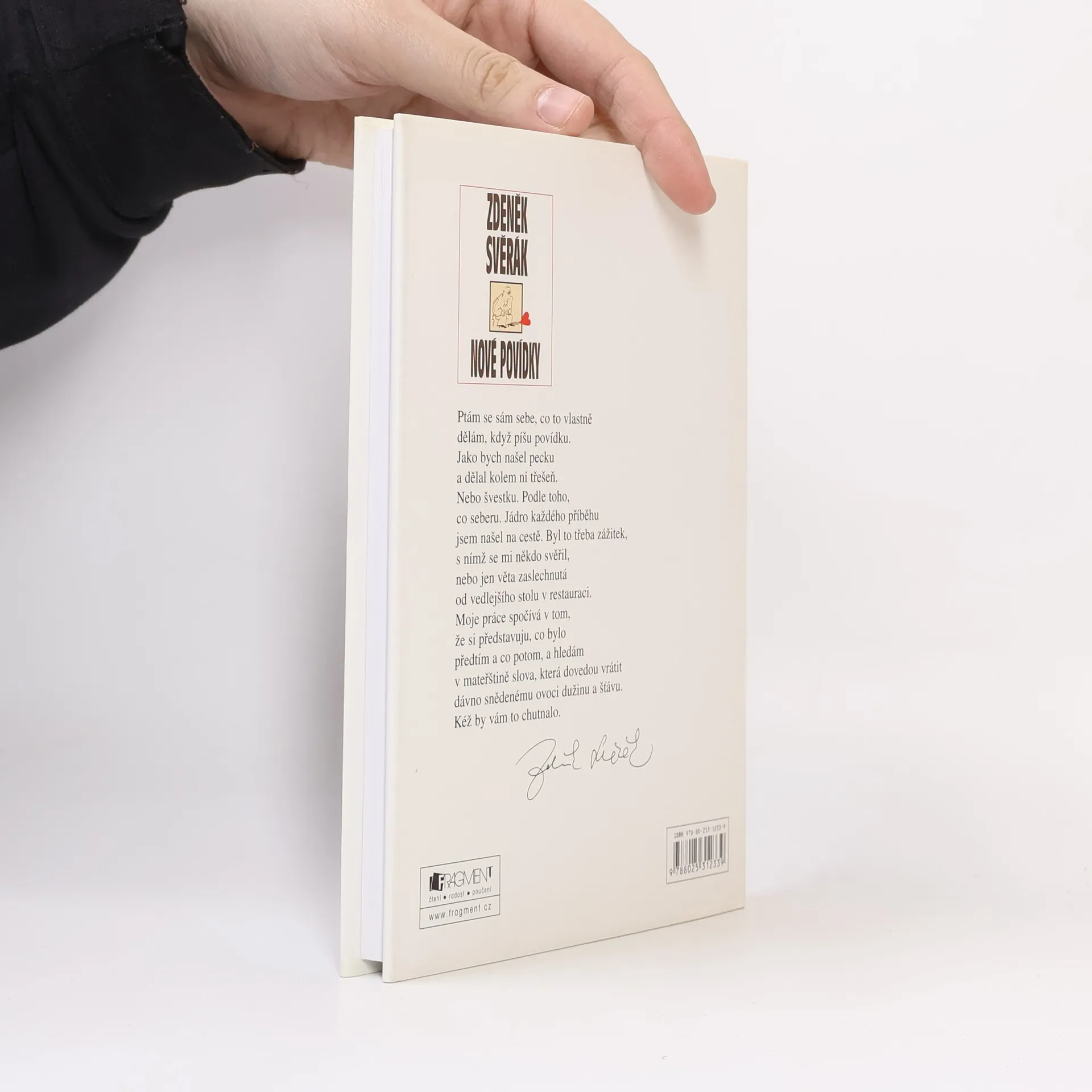 Ptám se sám sebe, co to vlastně dělám, když píšu povídku. Jako bych našel pecku a dělal kolem ní třešeň. Nebo švestku. Podle toho, co seberu. Jádro každého příběhu jsem našel na cestě. Byl to třeba zážitek, s nímž se mi někdo svěřil, nebo jen věta zaslechnutá od vedlejšího stolu v restauraci. Moje práce spočívá v tom, že si představuju, co bylo před tím a co potom, a hledám v mateřštině slova, která dovedou vrátit dávno snědenému ovoci dužinu a šťávu. Kéž by vám to chutnalo. Zdeněk Svěrák