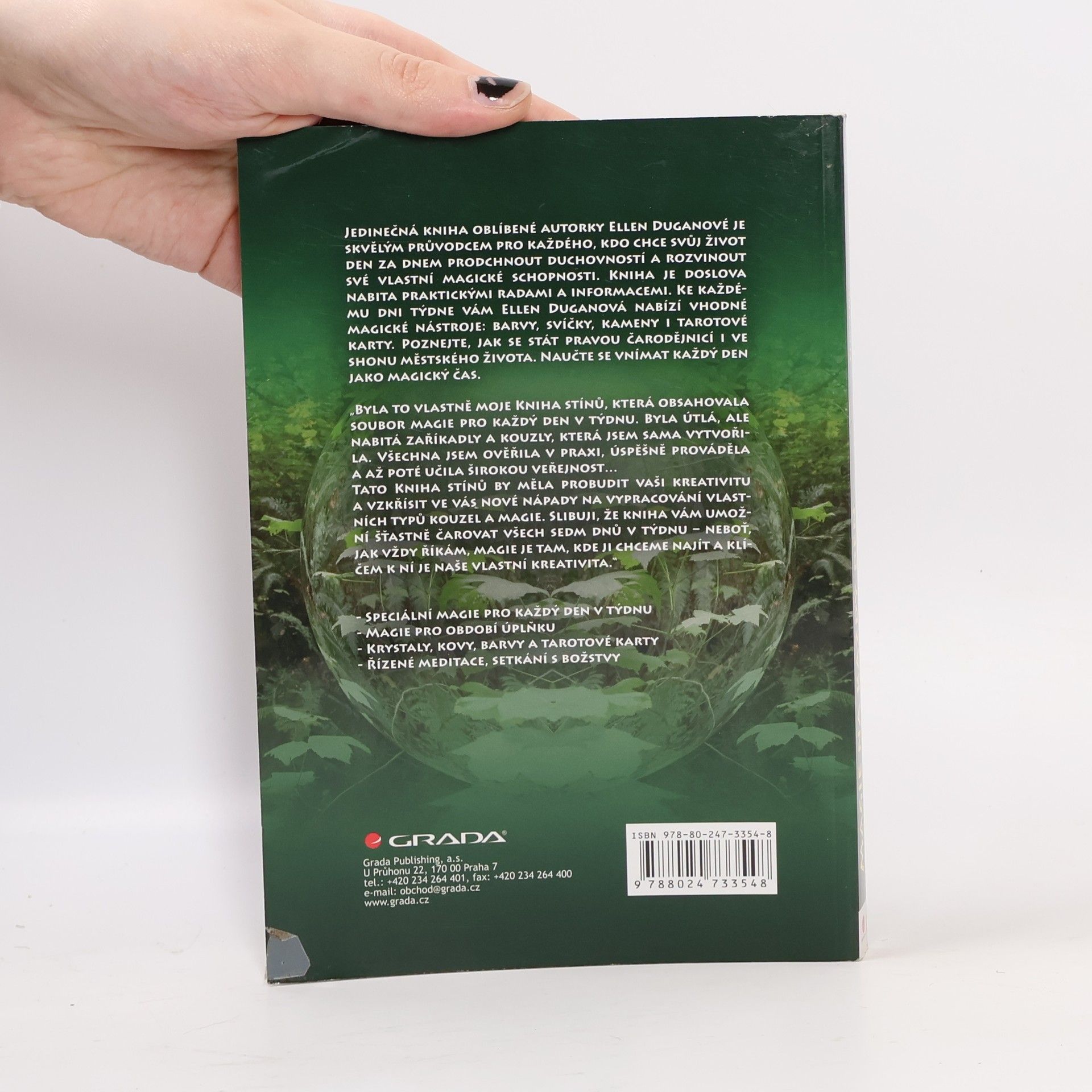 Podtitul: Praktická kouzla a zaříkávadla. Jedinečná kniha oblíbené autorky je skvělým průvodcem pro každého, kdo chce svůj život den za dnem prodchnout duchovností a rozvinout své vlastní magické schopnosti. Kniha je doslova nabita praktickými radami a informacemi. Ke každému dni týdne vám autorka nabízí vhodné magické nástroje: meditace, barvy, svíčky, kameny i tarotové karty. Poznejte, jak se stát pravou čarodějnicí i ve shonu městského života. Naučte se vnímat každý den jako magický čas.To podstatné, co od autorky očekáváte, zde samozřejmě je, ale můžete zde najít mnohem více praktické magie a dalších dodatků - kouzelné meditace, lektvary, recepty na nápoje lásky, čarodějné řemeslo, magii za úplňku a nové rituály pro každý den, které jsou propojeny se základními informacemi o krystalech, barvách, tarotových kartách a božstvech. Tato Kniha stínů by měla probudit vaši kreativitu a vzkřísit ve vás nové nápady na vypracování vlastních typů kouzel a magie.