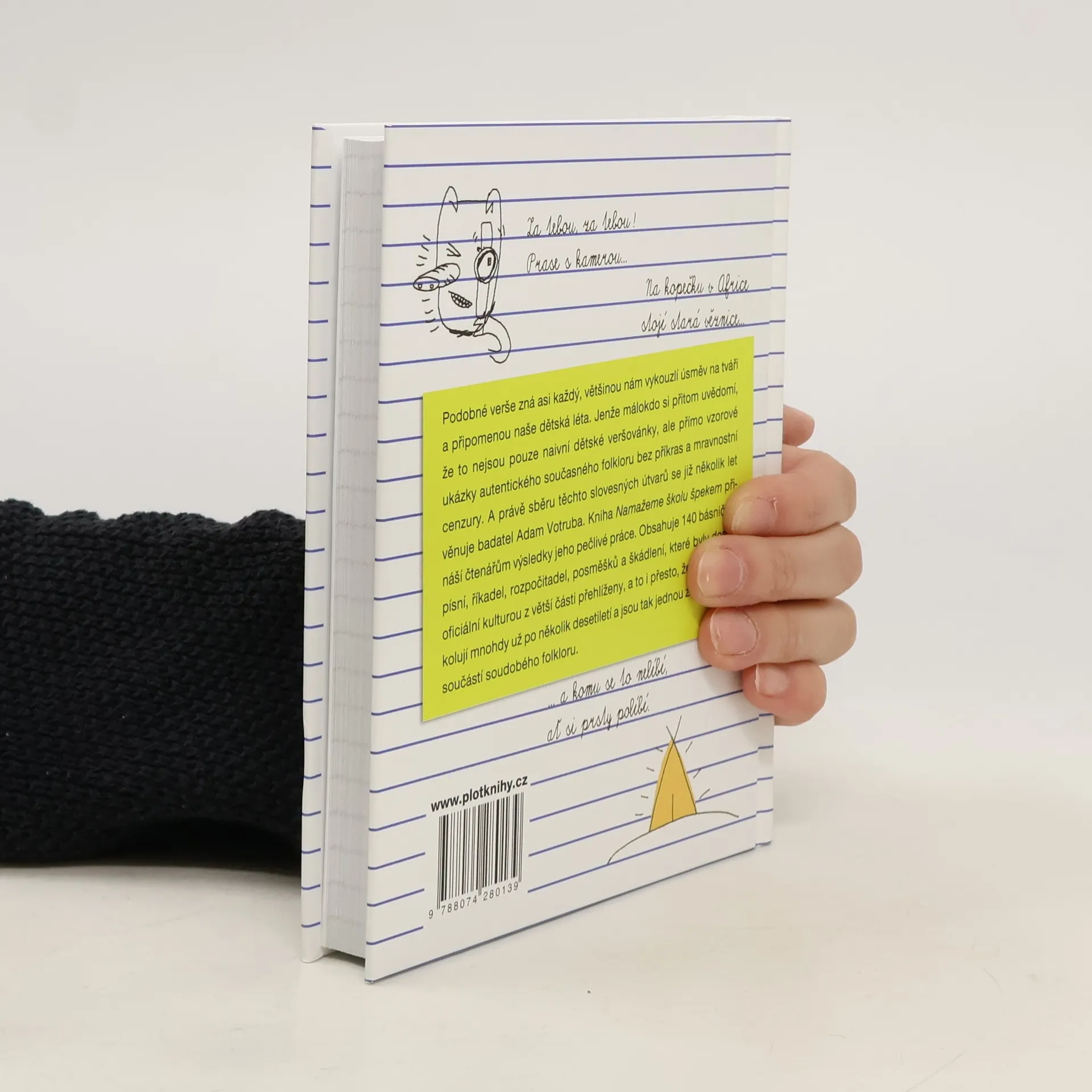 Za tebou, za tebou! Prase s kamerou... Na kopečku v Africe stojí stará věznice... Podobné verše zná asi každý, většinou nám vykouzlí úsměv na tváři a připomenou naše dětská léta. Jenže málokdo si přitom uvědomí, že to nejsou pouze naivní dětské veršovánky, ale přímo vzorové ukázky autentického současného folkloru bez příkras a mravnostní cenzury. A právě sběru těchto slovesných útvarů se již několik let věnuje badatel Adam Votruba. Kniha Namažeme školu špekem přináší čtenářům výsledky jeho pečlivé práce. Obsahuje 140 básniček, písní, říkadel, rozpočitadel, posměšků a škádlení, které byly dosud oficiální kulturou z větší části přehlíženy, a to i přesto, že mezi dětmi kolují mnohdy už po několik desetiletí a jsou tak jednou z nejživějších součástí soudobého folkloru.