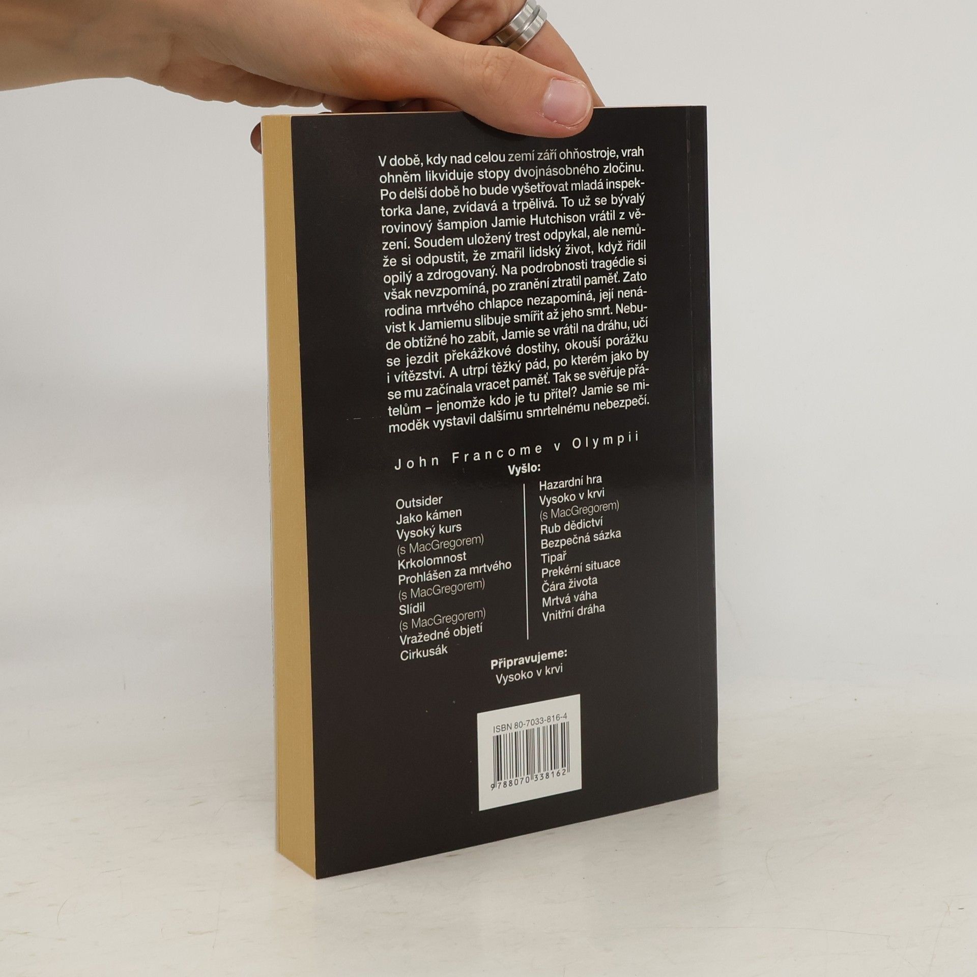 V době, kdy nad celou zemí září ohňostroje, vrah ohněm likviduje stopy dvojnásobného zločinu. Po delší době ho bude vyšetřovat mladá inspektorka Jane, zvídavá a trpělivá. To už se bývalý rovinový šampion Jamie Hutchison vrátil z vězení. Soudem uložený trest odpykal, ale nemůže si odpustit, že zmařil lidský život, když řídil opilý a zdrogovaný. Na podrobnosti tragédie si však nevzpomíná, po zranění ztratil paměť. Zato rodina mrtvého chlapce nezapomíná, její nenávist k Jamiemu slibuje smířit až jeho smrt. Nebude obtížné ho zabít, Jamie se vrátil na dráhu, učí se jezdit překážkové dostihy, okouší porážku i vítězství. A utrpí těžký pád, po kterém jako by se mu začínala vracet paměť. Tak se svěřuje přátelům - jenomže kdo je tu přítel? Jamie se mimoděk vystavil dalšími smrtelnému nebezpečí.