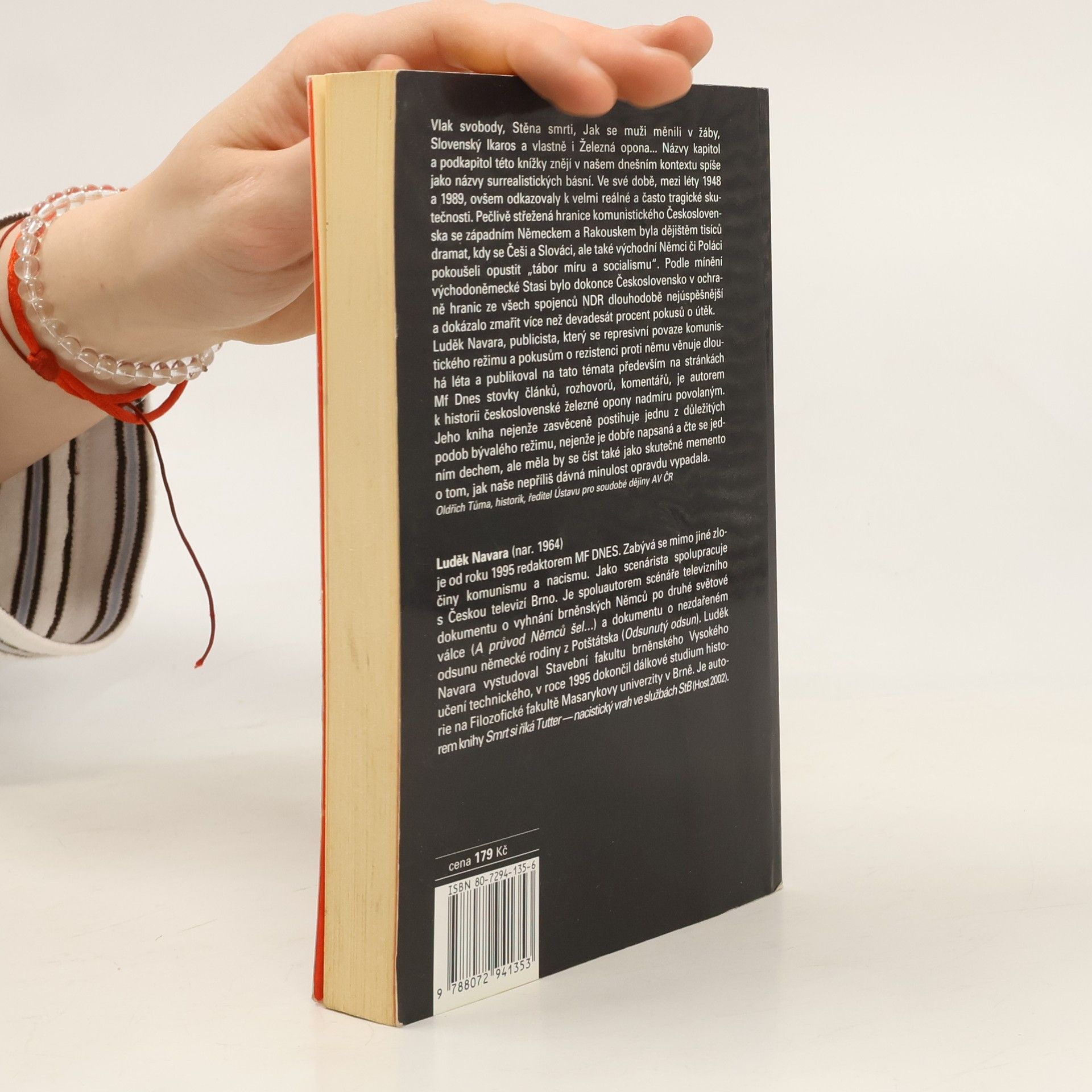 Vlak svobody, Stěna smrti, Jak se muži měnili v žáby, Slovenský Ikaros a vlastně i Železná opona... Názvy kapitol a podkapitol této knížky znějí v našem dnešním kontextu spíše jako názvy surrealistických básní. Ve své době, mezi léty 1948 a 1989, ovšem odkazovaly k velmi reálné a často tragické skutečnosti. Pečlivě střežená hranice komunistického Československa se západním Německem a Rakouskem byla dějištěm tisíců dramat, kdy se Češi a Slováci, ale také východní Němci či Poláci pokoušeli opustit “tábor míru a socialismu”. Podle mínění východoněmecké Stasi bylo dokonce Československo v ochraně hranic ze všech spojenců NDR dlouhodobě nejúspěšnější a dokázalo zmařit více než devadesát procent pokusů o útěk. Luděk Navara, publicista, který se represivní povaze komunistického režimu a pokusům o rezistenci proti němu věnuje dlouhá léta a publikoval na tato témata především na stránkách Mf Dnes stoželezné opony nadmíru povolaným. Jeho kniha nejenže zasvěceně postihuje jednu z důležitých podob bývalého režimu, nejenže je dobře napsaná a čte se jedním dechem, ale měla by se číst také jako skutečné memento o tom, jak naše nepříliš dávná minulost opravdu vypadala. Oldřich Tůma, historik, ředitel Ústavu pro soudobé dějiny AV ČRvky článků, rozhovorů, komentářů, je autorem k historii československé.