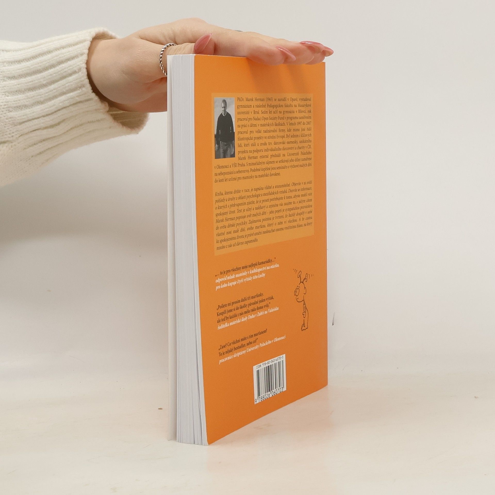 Kniha je cenná hlavně tím, že je napsána odborně, přitom naprosto srozumitelně, autor si s pomyslným čtenářem vlastně povídá. Objevíte v ní svěží pohledy a úvahy z oblasti sebepoznání, mezilidských vztahů a výchovy malých dětí. Dozvíte se informace, o kterých s překvapením zjistíte, že je prostě potřebujete k tomu, abyste mohli vést spokojený život. Text v knize je silný a místy až naléhavý a zejména vás zaujme to, s jakým citem Marek Herman popisuje svět malých dětí.