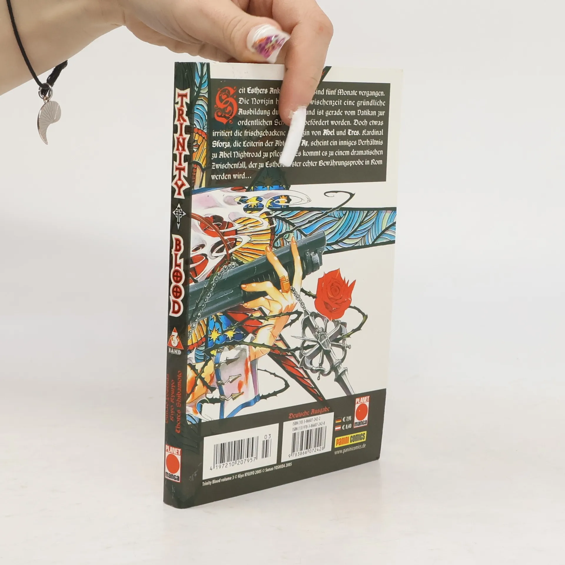 TRINITY BLOOD 3 Seit Esthers Ankunft in Rom sind fünf Monate vergangen. Die Novizin hat in der Zwischenzeit eine gründliche Ausbildung durchlaufen und ist gerade vom Vatikan zur ordentlichen Schwester befördert worden. Doch etwas irritiert die frischgebackene Kollegin von Abel und Tres. Kardinal Sforza, die Leiterin der Abteilung Ax, scheint ein inniges Verhältnis zu Abel Nightroad zu pflegen. Es kommt es zu einem dramatischen Zwischenfall, der zu Esthers erster echten Bewährungsprobe in Rom werden wird.
