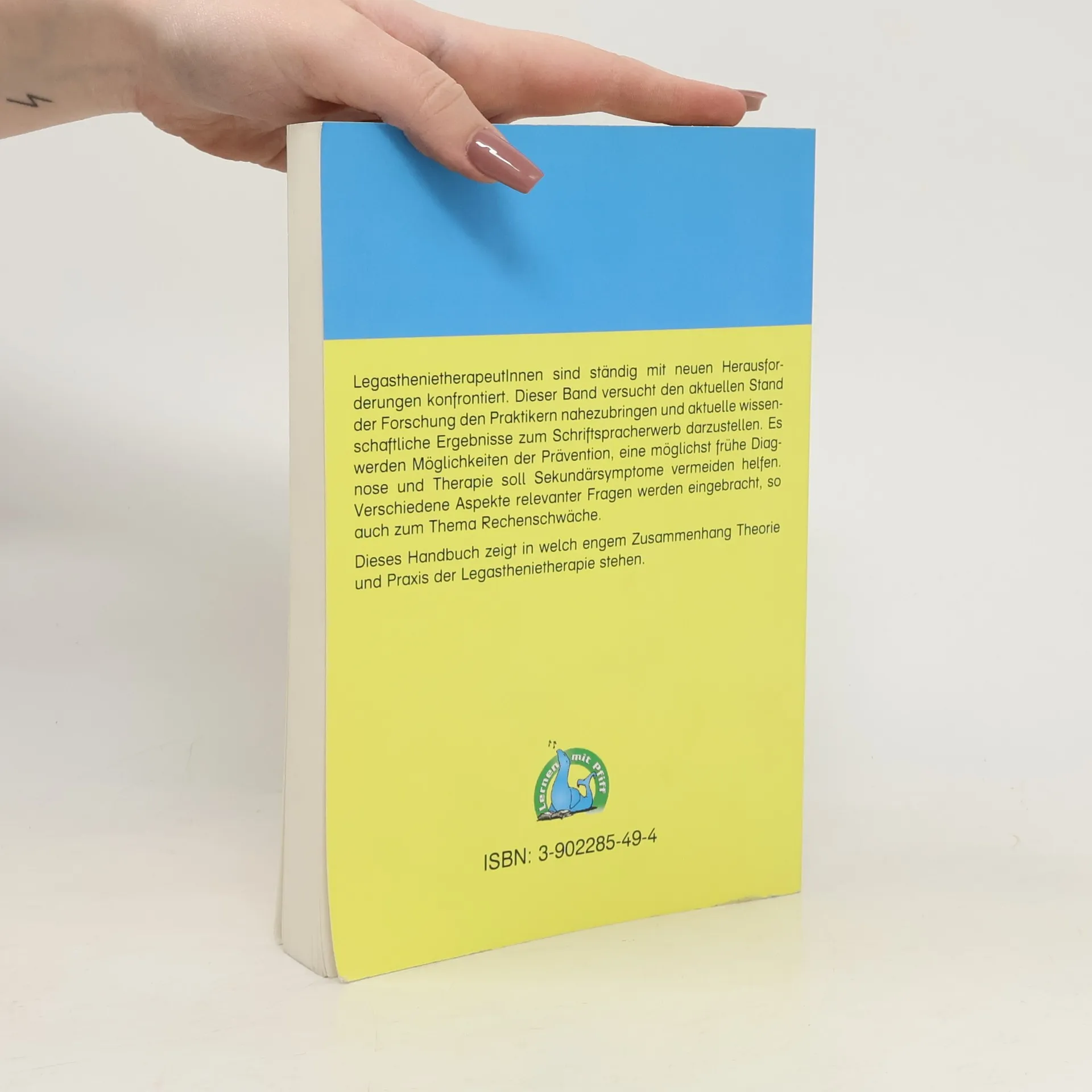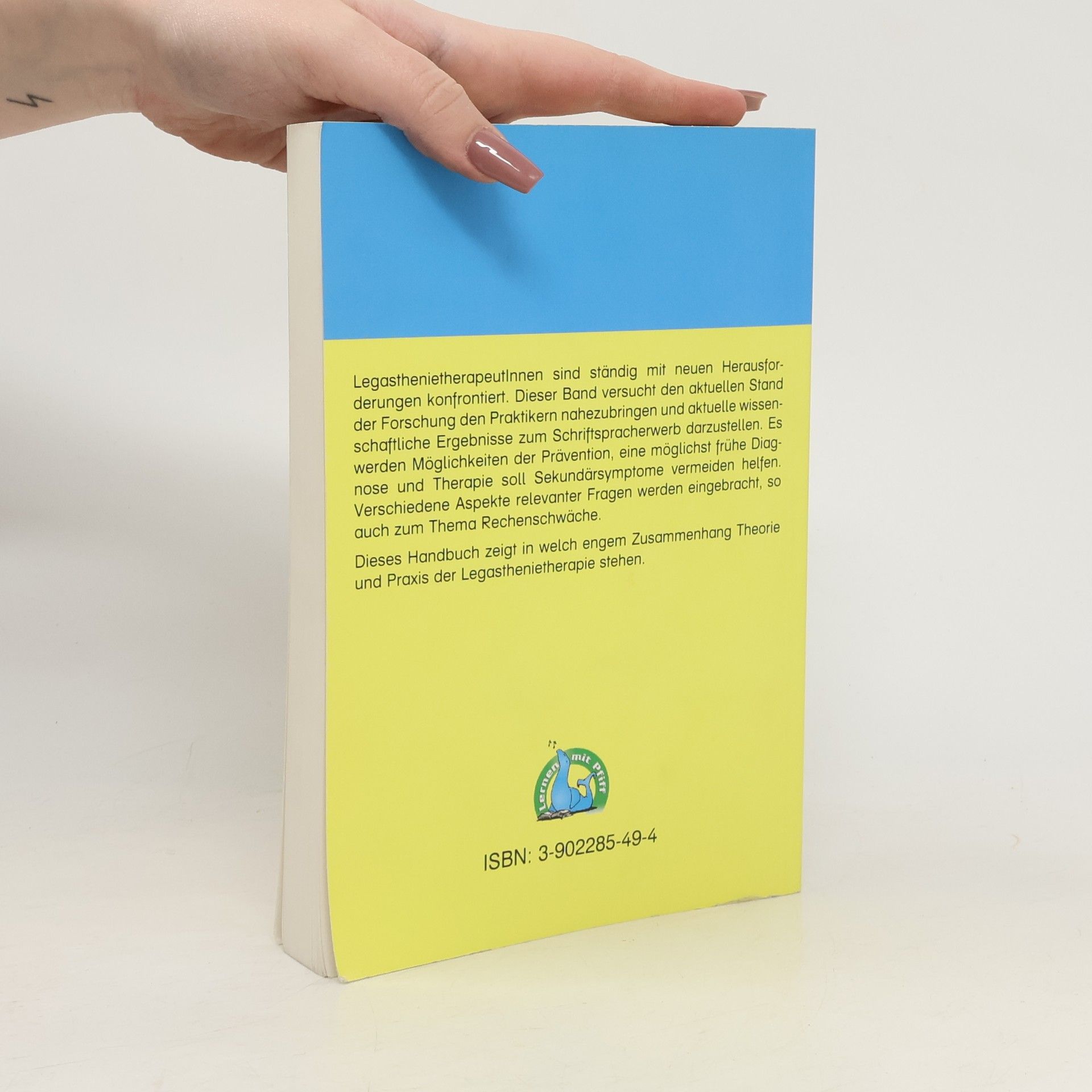 LegasthenietherapeutInnen sind ständig mit neuen Herausfor-derungen konfrontiert. Dieser Band versucht den aktuellen Stand der Forschung den Praktikern nahezubringen und aktuelle wissen-schaftliche Ergebnisse zum Schriftspracherwerb darzustellen. Es werden Möglichkeiten der Prävention, eine möglichst frühe Diag-nose und Therapie soll Sekundärsymptome vermeiden helfen. Verschiedene Aspekte relevanter Fragen werden eingebracht, so auch zum Thema Rechenschwäche. Dieses Handbuch zeigt in welch engem Zusammenhang Theorie und Praxis der Legasthenietherapie stehen.