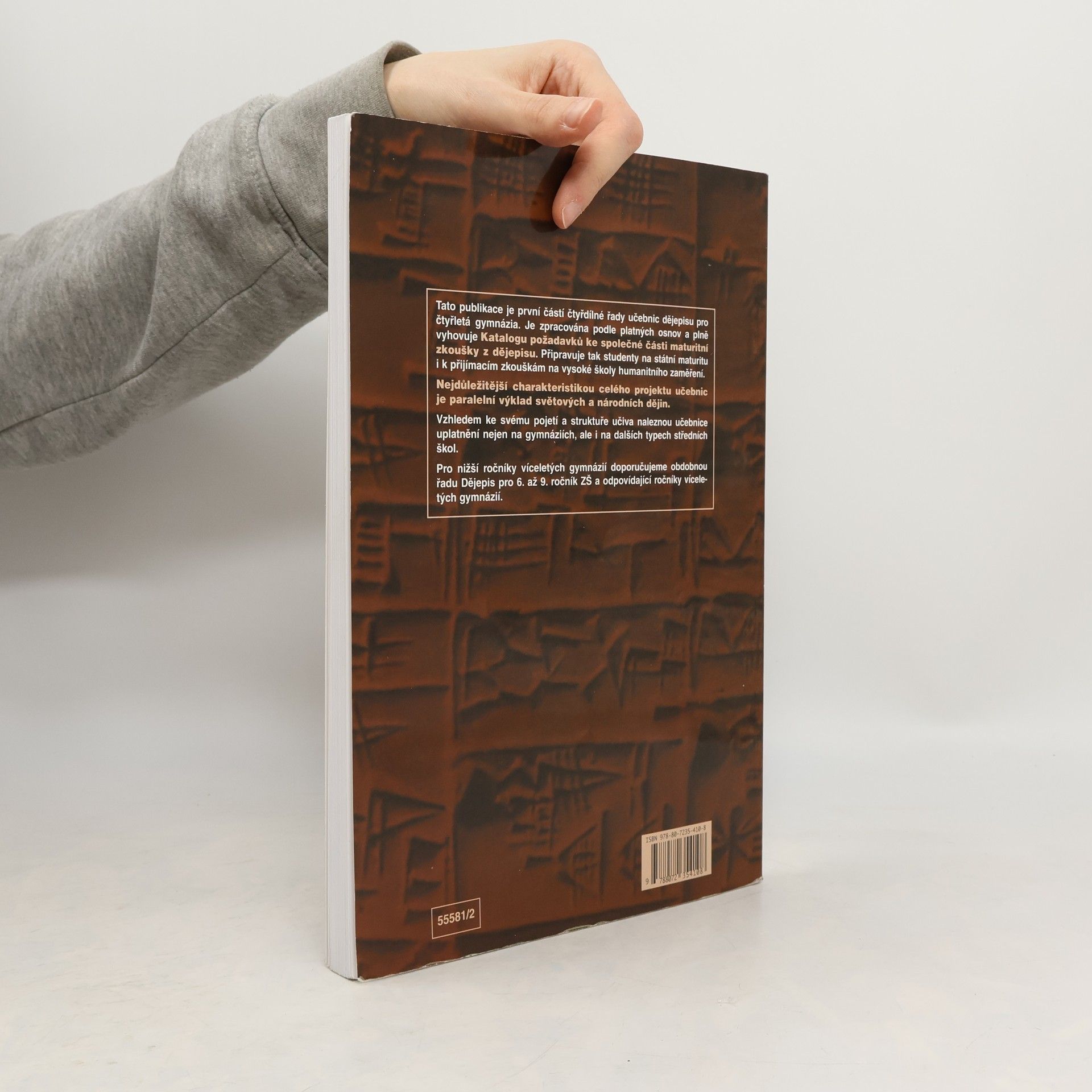 Pravěk a starověk Publikace je prvním dílem čtyřdílné řady učebnic pro čtyřletá gymnázia. Je zpracována podle osnov pro čtyřletá gymnázia. Uplatní se ale i na dalších typech škol, neboť v učebnicích je graficky odlišen základní výklad od rozšiřujícího textu. Vzhledem k rozvržení učiva s důrazem na nové dějiny umožňuje i dobrou přípravu ke studiu na V.Š. humanitního typu. Podstatnou kvalitou řady je její nepřetíženost fakty a především paralelně vedený výklad obecných i národních dějin od nejstarších dob po současnost. Učebnice obsahují bohatý obrazový materiál, početné dějepisné mapy a náležitý didaktický aparát.Pro nižší ročníky víceletých gymnázií doporučujeme obdobnou řadu pro primu až kvartu. Pro každý ročník je určena rovněž jen jedna učebnice. K těmto učebnicím jsou vydány i pracovní sešity. Informace o nich najdete v nabídce pro Z.Š. Všechny tyto učebnice mají schvalovací doložku MŠMT ČR.